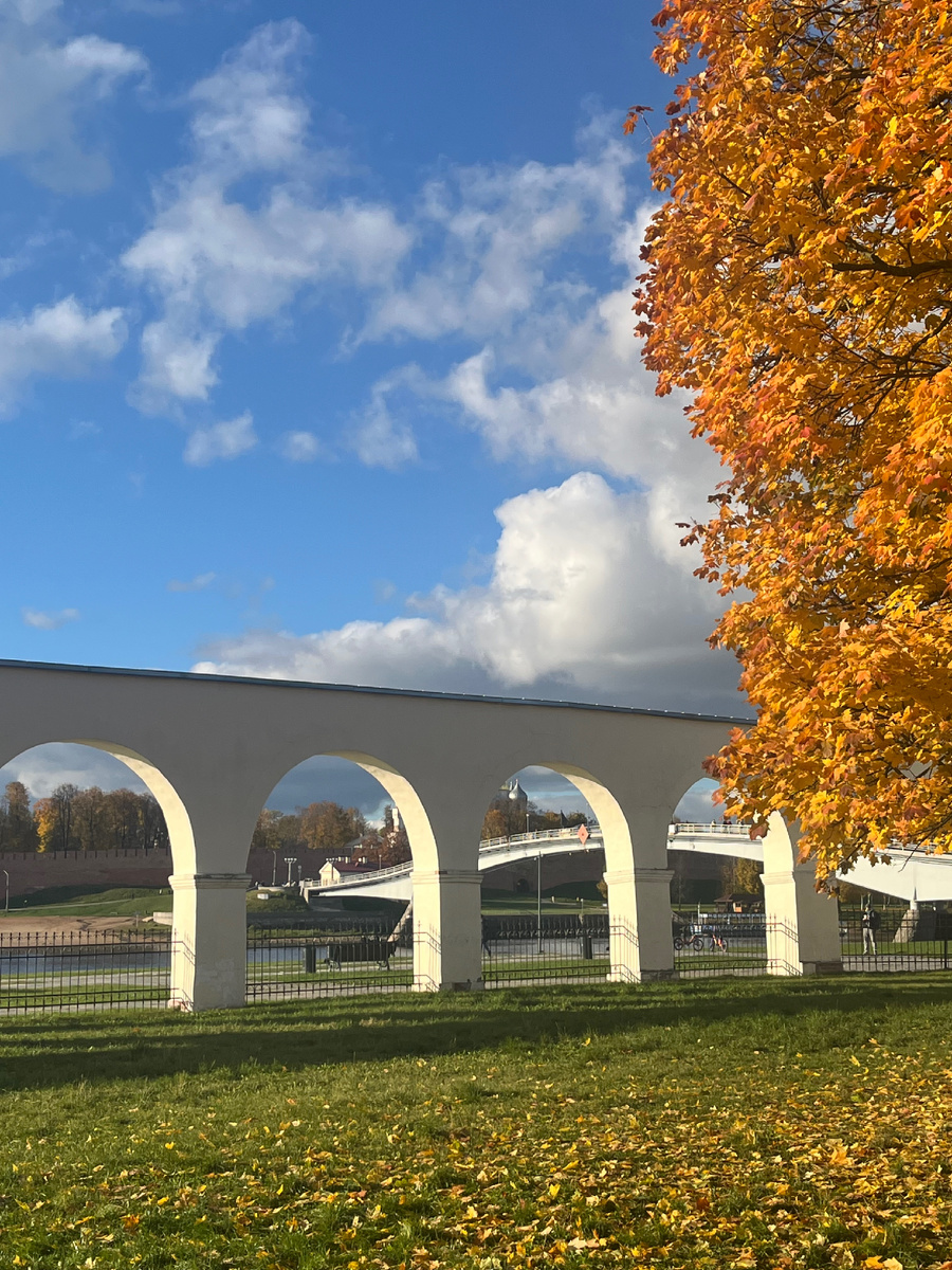 - Аркада Гостиного двора: На Ярославовом Дворище сохранился фрагмент Аркады Гостиного двора — белые каменные арки в стиле классицизма, остатки монументального торгового комплекса, разрушенного во время Великой Отечественной войны. Это напоминание о былом величии новгородской торговли.