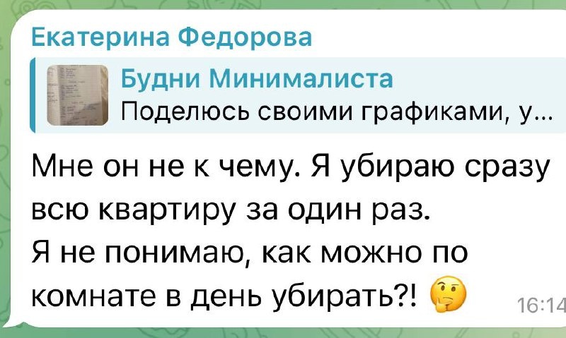 Когда не ходила на работу, то тоже убирала сразу все. Теперь время ограничено, потребность жить в чистой квартире есть, но возможности тратить много времени на уборку нет. Поэтому для меня оказался это идеальным вариантом, когда раз в неделю я уделяю внимание одной комнате. Это и дисциплинирует, и дома и правда почище становится, чем когда жду выходные, чтобы убрать дом.
