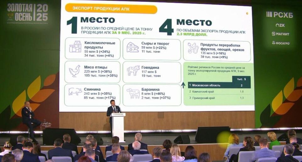 Экспорт продукции агропромышленного комплекса стал одним из ключевых факторов роста экономики Московской области. О высоких качественных показателях и технологических решениях рассказал губернатор Андрей Воробьев на пленарном заседании 27-й Российской агропромышленной выставки «Золотая осень». За девять месяцев 2025 года на долю продукции агропромышленного комплекса Подмосковья пришлось около 20% всего регионального экспорта. Андрей Воробьев подчеркнул, что в области активно развивают логистическую инфраструктуру, включая «сухие порты» в Наро-Фоминске, Дмитрове и Ногинске, через которые сегодня проходит четверть всех контейнерных грузов России. Важный показатель — добавленная стоимость. По средней цене экспортируемой продукции Подмосковье сейчас занимает первое место в России. Этот показатель составляет около двух тысяч долларов за тонну, что позволило региону обогнать Камчатский край и Приморье. Губернатор пояснил, что такого результата удалось достичь за счет повсеместной цифровизаци