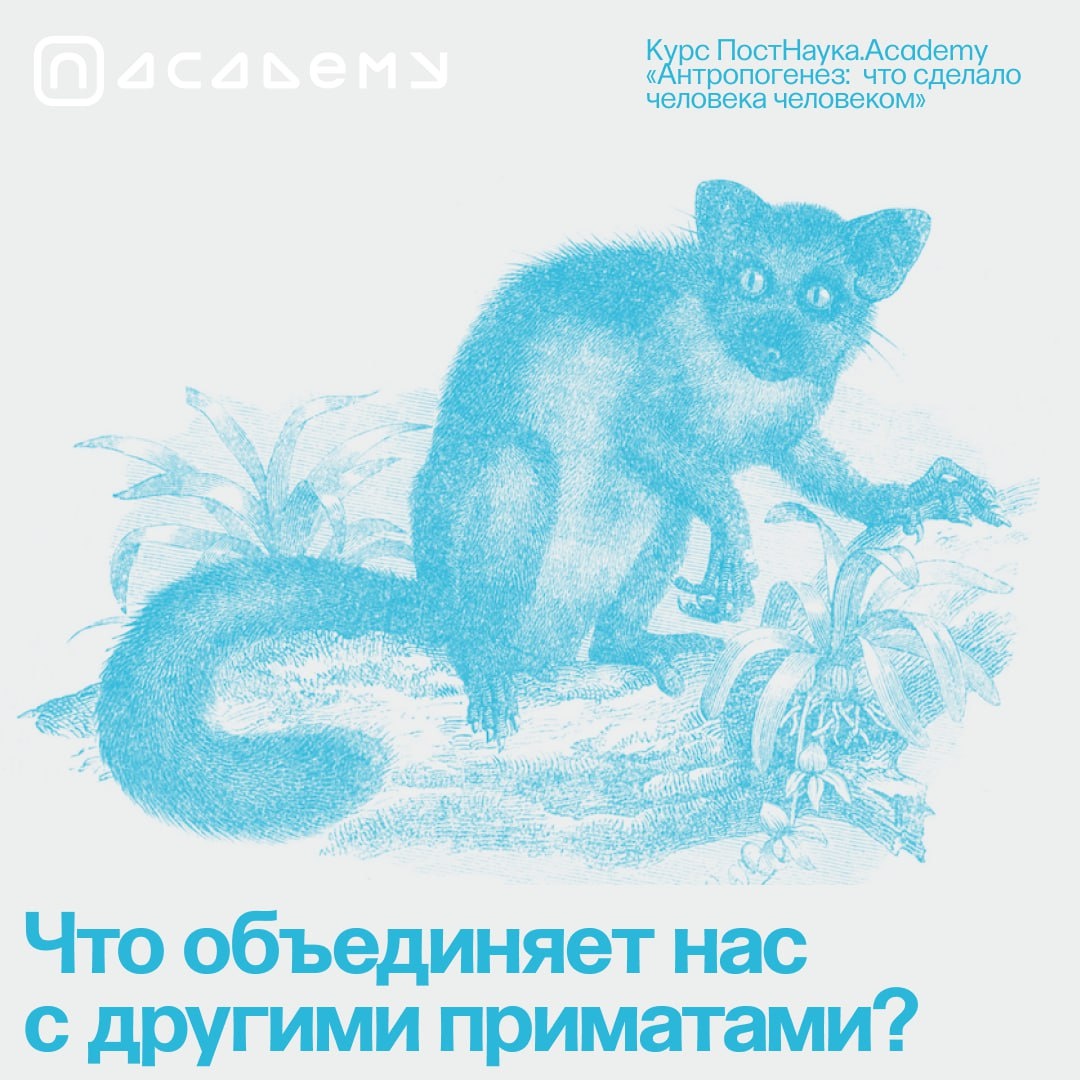 Человеку невозможно познать самого себя, не зная ближайших родственников. Человек — представитель отряда приматов. Этот отряд — один из самых многочисленных и разнообразных в классе млекопитающих. Примитивные представители отряда приматов включают тупай, шерстокрылов, ископаемых и современных полуобезьян. Кто такие приматы? Разбираем в одном из уроков курса Академии ПостНауки «Антропогенез». Посмотреть содержание и купить курс можно по ссылке: https://postnauka.org/link/evolution_tg