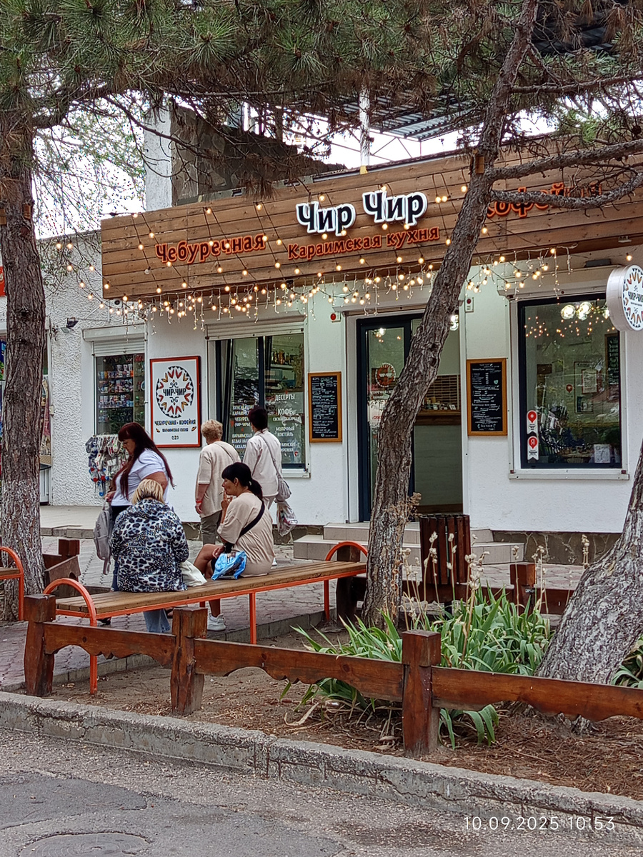Как-то так сложилось, что не попробовав местной кухни - отпуск и не отпуск вовсе. Если вы были в Крыму и не попробовали блюда караимской и крымско-татарской кухни - значит вы не были в Крыму. Чир-чиры пробовали во многих местах, в прошлый приезд фаворитами поедания чебуреков (чир-чиры по сути чебуреки) оказался ресторан на Байдарских воротах. Сейчас помыкавшись по разным заведениям Евпатории остановили свой выбор на кафе "Чир-чир". Это сетевое кафе-чебуречная караимской кухни. Мы же зашли в то, которое на улице Фрунзе. А пошли сюда ориентируясь на хорошие отзывы. Кафе небольшое, специализируется на караимской кухне. Есть караимские пирожки стоимостью от 130 рублей, чир-чиры от 150 рублей и всяческие напитки. Откуда возникло такое название? Многое в Крыму имеет греческие корни и тесно переплетенную с крымско-татарским периодом. Вот такой получился симбиоз кухонь и названий. Особенность рецепта заключается в форме, больших размерах, тонкости и сухости теста, начинок масса - от сыра, зеле