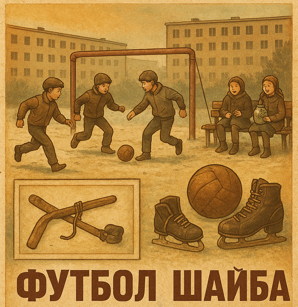 Тот, кто имел спортивную форму — шорты, гетры или бутсы — считался почти профессионалом. 🏒 Зимой — хоккей С приходом морозов футбол уступал место хоккею. Катки заливали прямо во дворах: шланг, несколько ведер — и лед готов. Клюшки делали из досок, шайбы — из каблуков старых ботинок. «Щитки» — из книжек, обмотанных ремнями, а вратари ловили шайбы обычными варежками. Но азарт — настоящий, и любовь к игре — безграничная. Если