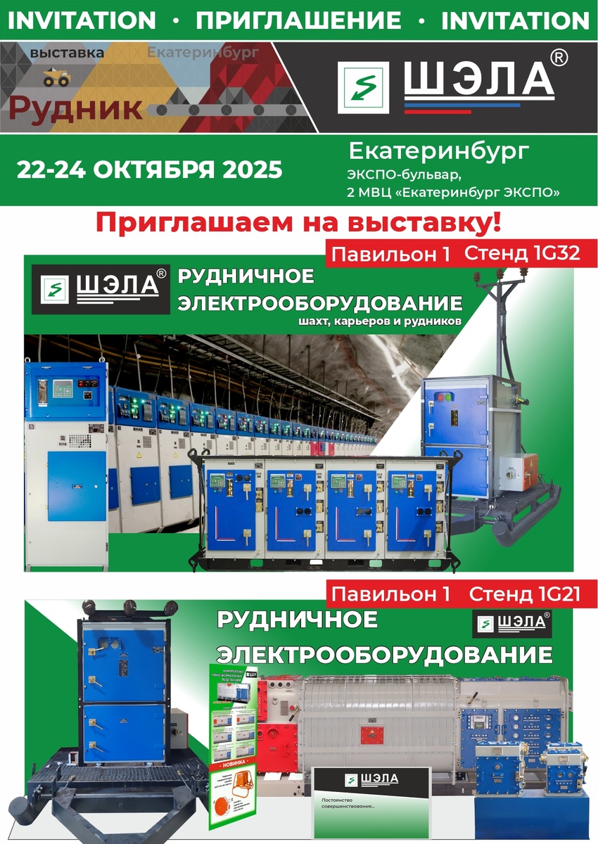 Уважаемые коллеги и партнеры! Копания ШЭЛА с радостью приглашает вас посетить наши стенды на ежегодной вытавке "Рудник - 2025", которая состоится в Екатеринбурге с 22 по 24 октября 2025 года в МВЦ «Екатеринбург ЭКСПО» (Экспо-бульвар, 2). В этом году мы представим вашему вниманию передовые решения в области электрооборудования, разработанные специально для нужд горнодобывающей промышленности. Наша экспозиция будет включать: • Комплектные трансформаторные подстанции КТП-РН (КТП-РВ); • Ячейка карьерная наружной установки отдельностоящая ЯКНО 6 (10) кВ; • Комплектное распределительное устройство мобильное малогабаритное КРУ-РН-6(10)-ММ-630; • Комплектные распределительные устройства типа КРУ-РН-6-ВВ; • Взрывозащищенное рудничное электрооборудование. Мы будем рады продемонстрировать вам наши новинки, ответить на все интересующие вопросы и обсудить возможности взаимовыгодного сотрудничества. Наши стенды – 1G32 и 1G21 – расположены в 1 павильоне. Компания ШЭЛА с нетерпением ждет встречи