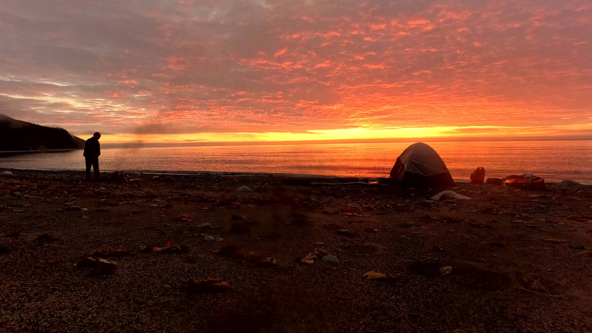Раннее пробуждение. В палатке непонятно, что небо красное. Открываешь дверь, через тамбур можно догадаться, но тоже мутно и неточно. В общем, такие ранние подъёмы раньше будильников не просто так... значит, что-то зовёт меня... Прекрасный рассвет, но сидеть и просто смотреть никак не получится... ещё столько дел. И по плану пройти 34-40 км, а я вчера устал, проплыв 27 км. По карте я насмотрел, что ближайшее место для ночёвки в 34 км от дальней точки пляжа Ланге. По карте там везде скалы и короткий берег, а на Охотском море приливы до 2 метров, смоет с любого берега у скал (такое у меня было представление). Забегу вперёд: 3-4 места для ночёвки за первые 20 км я встретил точно, дальше 14 км — ещё 3-4 места для ночёвки. Конечно, надо понимать, что иногда отвесные скалы над головой, и всякое бывает, но я ночевал так около 4 ночей. Пытаемся понять, какая порода чаще осыпается по тем местам, где уже осыпалась она. И ещё: чем ниже высота скалистой стены, тем безопаснее.