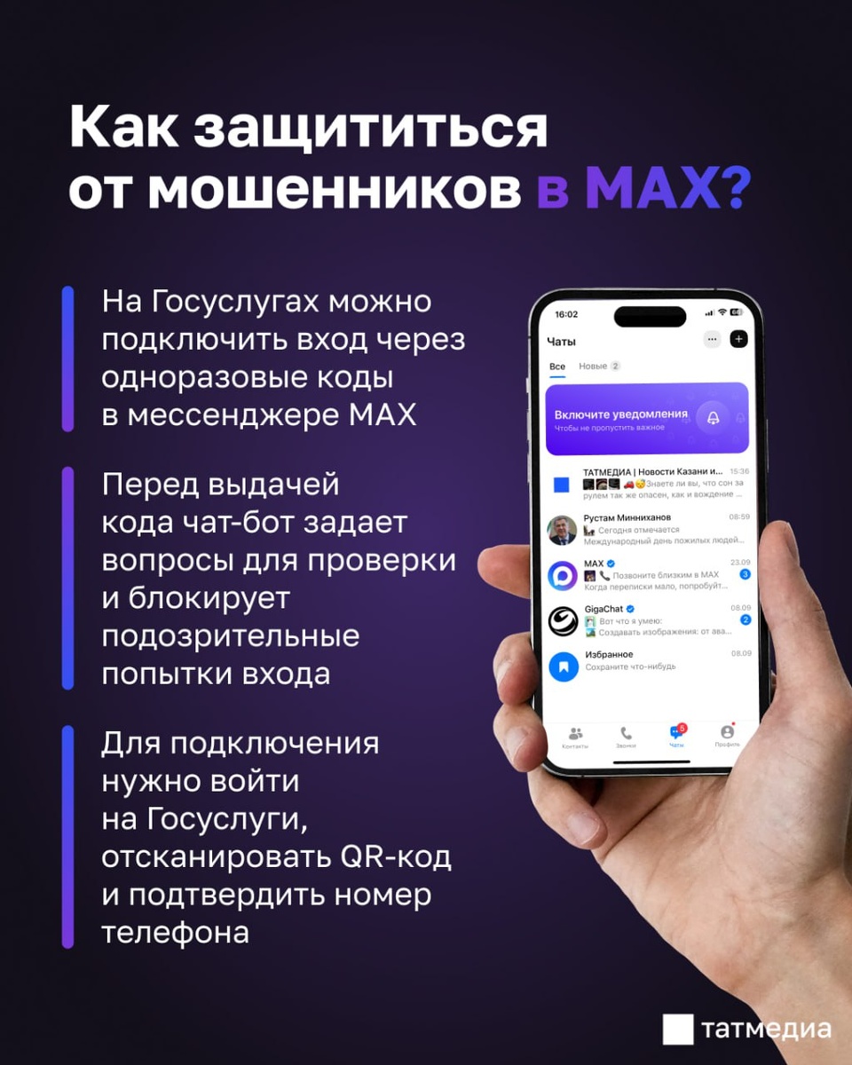 В ответ на пост 📲👌Татарстанцам рассказали, как защитить данные от мошенников через MAX Жители республики смогут входить на Госуслуги с одноразовыми кодами в MAX. Система заменяет SMS и повышает безопасность. @tatmediaofficial | Все каналы Татмедиа ™️ 1-й новостной MAX-канал Татарстана - подпишитесь.