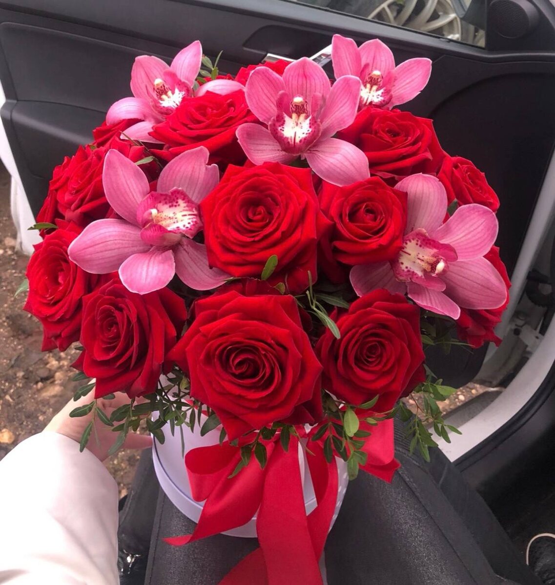 Букет в коробке с бархатными красными розами и орхидеями😍❤️🔥