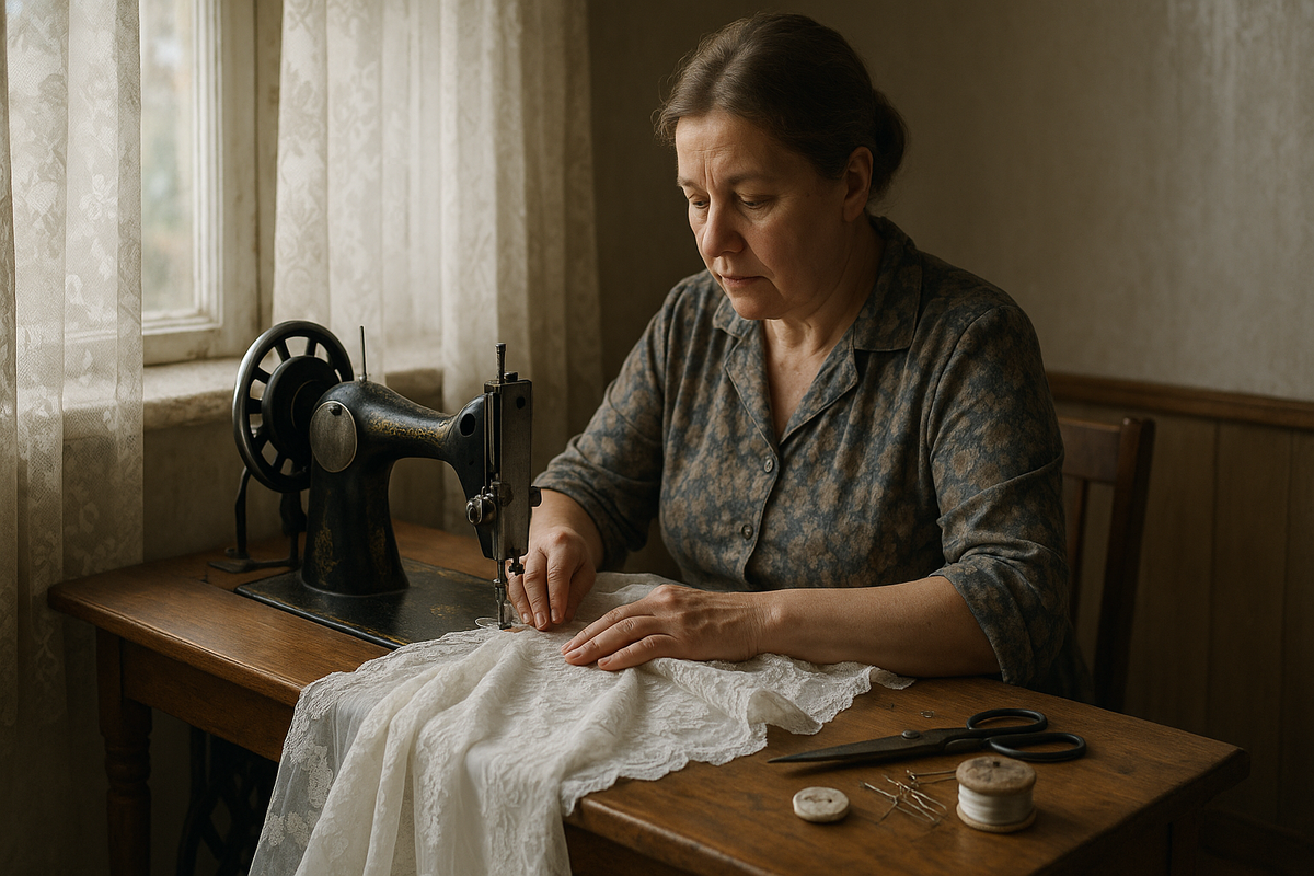 Елена сидела у окна, подшивая подол свадебного платья. Пальцы двигались автоматически — сорок пять лет за швейной машинкой научили работать не глядя.