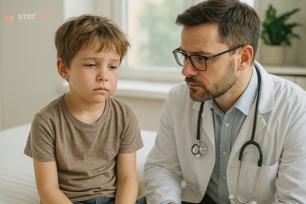 Даня сидел на краю больничной кушетки, вытянув ноги, которые не доставали до пола. Его пальцы вцепились в холодный винил так крепко, что костяшки побелели. Лицо, некогда круглое и весёлое, теперь исказилось болью и странным, непонятным страхом. Под подбородком кожа вздулась, словно под ней прятался грейпфрут. Натянутая, покрасневшая, вся в тонких, сердито пульсирующих венках. Казалось, что под ней что-то живое, что-то шевелится, медленно растёт.