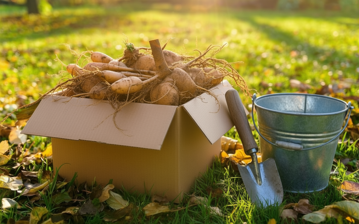 Опытные цветоводы хранят георгины в деревянных ящиках, выстланных сухим мхом. Предлагаю адаптировать метод под современные реалии: вместо ящиков используем плотные картонные коробки из-под бананов — они прочные, глубокие и легко доступны.