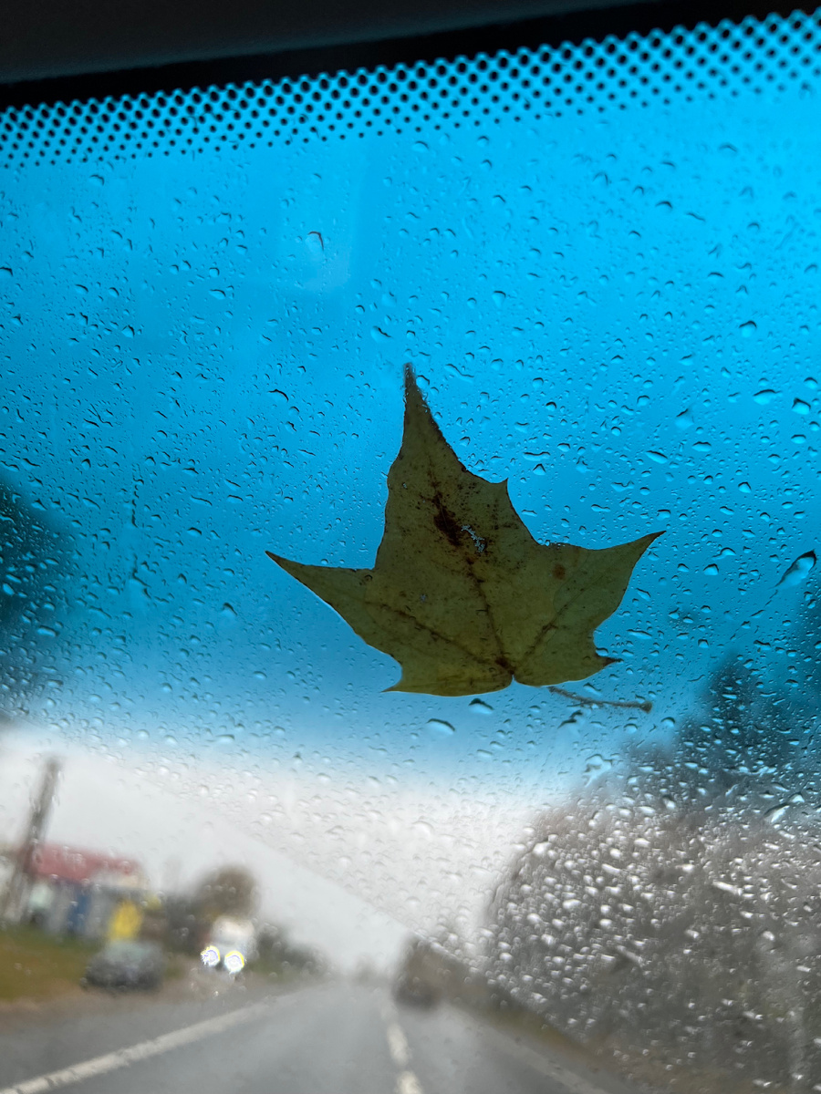 Листик довольно долго не сдавался и не поддавался постоянно работающим дворникам, иначе было невозможно ехать. Уже тогда захотелось написать сказку об отважном путешественнике, но мысли мыслями, а нужные слова не находились.