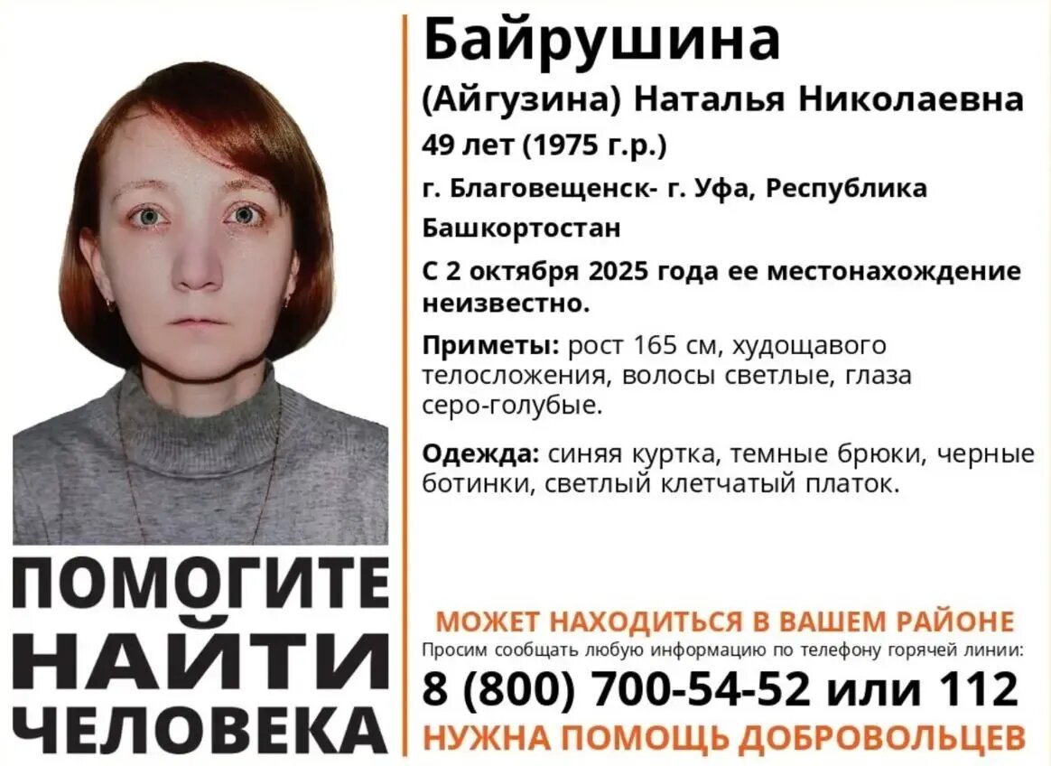 2 октября бесследно исчезла 49-летняя жительница Благовещенска Наталья Байрушина (Айгузина). Поисковый отряд «Лиза Алерт РБ» сообщил, что женщина была одета в темные брюки, черные ботинки, синюю куртку клетчатый платок.