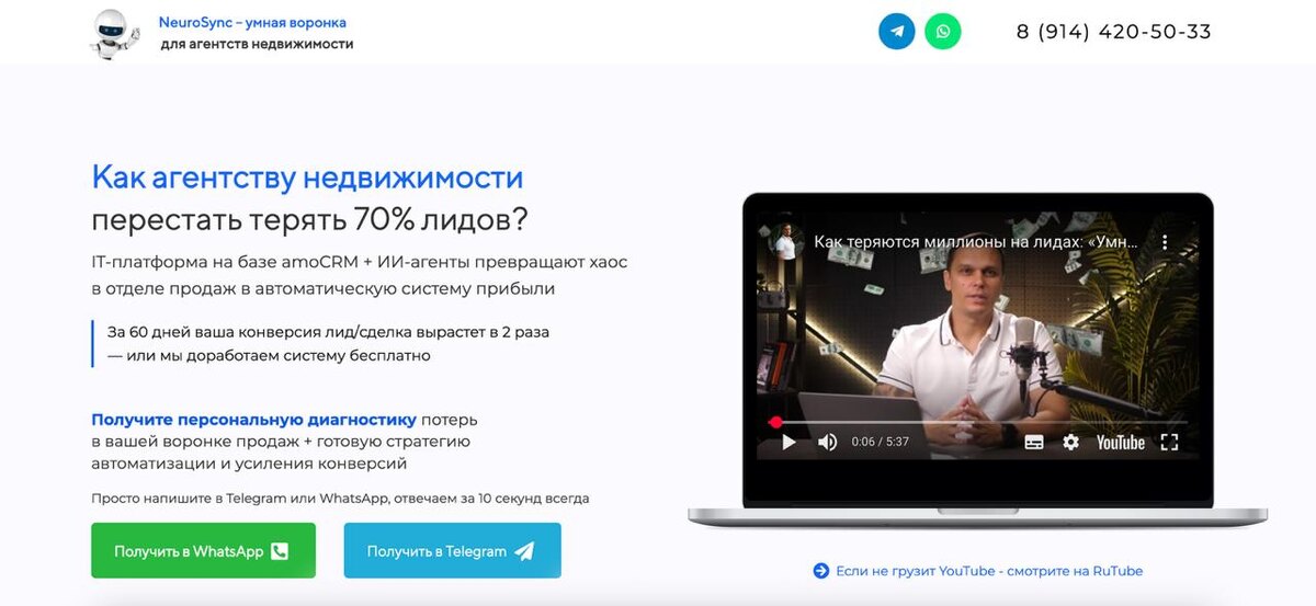 Потратил полгода на создание системы, которая превращает хаос в риелторских отделах в автоматическую машину продаж - и наконец запустил сайт ! NeuroSync - это когда ИИ работает вместо половины отдела продаж, но лучше и без больничных. Система мгновенно отслеживает каждого лида 24/7, автоматически прогревает их нужным контентом и даже ведёт переговоры. Плюс запилил крутой видос прямо на сайте, где показал и рассказал, как всё это работает изнутри. Моментальный отклик на всех лидов вашим гениальным ИИ-риелтором, автоматический прогрев и дожим всех лидов контентом, полная картина по обработке каждого лида, ИИ контролирует переговоры и выдаёт отчёт, все лиды со всех источников учитываются, ключевые задачи автоматически ставятся сотрудникам. За 60 дней конверсия лид/сделка вырастает в 2 раза, или дорабатываем систему бесплатно. Персональная диагностика потерь в воронке продаж плюс готовая стратегия автоматизации - всё это получаете после первого же обращения. Сделайте благое дело - отпр