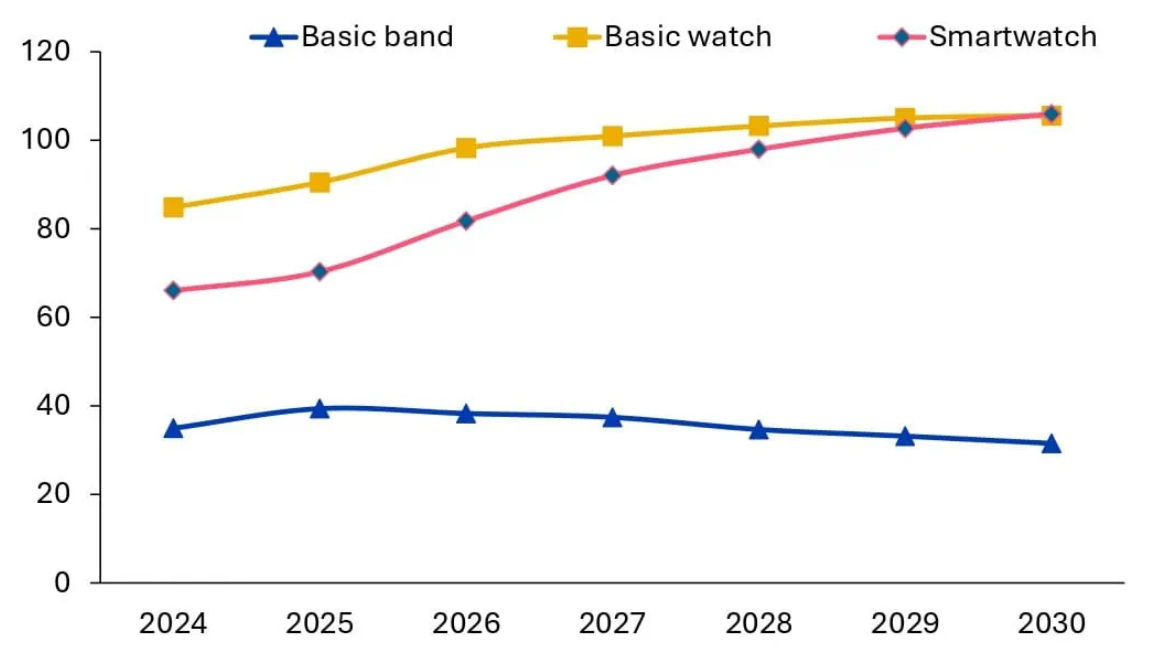В компании Omdia оценили мировые поставки носимых на запястье гаджетов за II кв. 2025 г. в 50,2 млн единиц, что на 13% превосходит достижение аналогичного прошлогоднего периода. Всего же по итогам текущего года, как уверены аналитики, устройств такого рода будет отгружено в канал продаж на 8% больше, чем в 2024 г., а в будущем году — ещё на 9% больше. Поставки различных категорий назапястных гаджетов по годам, млн единиц: фитнес-браслеты с базовой функциональностью (синяя линия), умные часы с фиксированным набором возможностей (жёлтая), допускающие установку приложений пользователем умные часы (красная), оценка и прогноз Эксперты Omdia видят в стабильном, на протяжении уже многих лет, росте спроса на назапястные гаджеты отражение всё большего внимания потребителей всего мира к собственному здоровью, занятиям физкультурой и спортом. Персонализированные приложения для контроля физического состояния и активности, полагающиеся как раз на такие гаджеты для отслеживания основных параметров ф