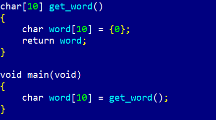 Когда-то я написал статью про программирование игры "5 букв": И вот в комментариях появился пользователь, который с уверенным видом начал раздавать поучения: это плохо, то плохо, это не так и т.д. Что ж, он достаточно долго смотрел в бездну. Кстати, тут не помешает почитать ещё вот эту статью: Итак, в чём суть. Функция в языке C не может возвращать массив фиксированной длины как копию. То есть нельзя написать такую функцию, которая имела бы тип массива с длиной, предположительно вот так: На что следует вот такой комментарий: Естественно, без каких-либо доказательств. Но есть один ценный совет: Давайте же ему последуем. А вот и пункт 6.9.1 стандарта, про функции: Нет, не может функция возвращать массивы. Я делаю вместо массива структуру, потому что структуру функция вернуть может: Очевидно, разницы с массивом у этой структуры нет никакой, она эквивалентна массиву, но вот массив вернуть нельзя, а структуру можно. Это связано с обратной совместимостью версий языка C. Если вкратце, раньше
