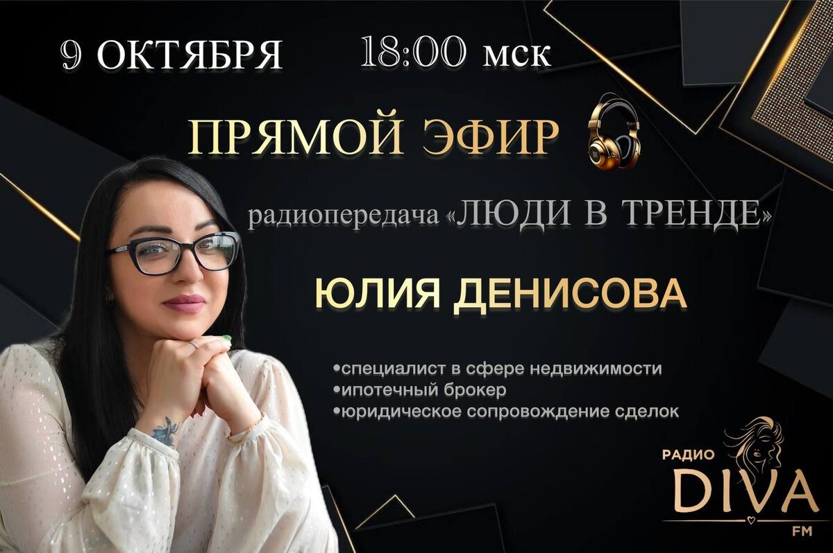 💎РОСКОШНАЯ И УСПЕШНАЯ: Юлия Денисова о недвижимости, деньгах и женской силе 🎙️ Уже завтра , 9 октября в 18:00 мск не попустите прямой эфир на радио “ДИВА FM” передачи «Люди в тренде» с роскошной гостьей ! ЮЛИЯ ДЕНИСОВА @yullenka_d - специалист в сфере недвижимости и ипотечный брокер с яркой историей. Она знает все подводные камни и готова поделиться секретами успешных сделок! ✨Её путь — это доказательство того, что любые вершины по плечу, главное — знать, куда идти. Мы будем говорить откровенно и по делу: 💥ИСТОРИЯ СИЛЫ И УСПЕХА Как Юлия пришла в профессию и прошла путь через взлёты и падения к своему делу? Её жизненный путь и искренняя история вдохновит каждую! 🏠 ФОКУС НА КАЛИНИНГРАД: ❤️Стоит ли сейчас рассматривать покупку недвижимости в Калининграде? ❤️Плюсы, риски и подводные камни. ❤️Районы Калининграда: где лучше жить, а где выгоднее покупать? ❤️Разберем актуальные тенденции. 📉 ИПОТЕКА: РЕАЛЬНОСТИ 2025 Разберём актуальные условия кредитования и главные ловушки, которых