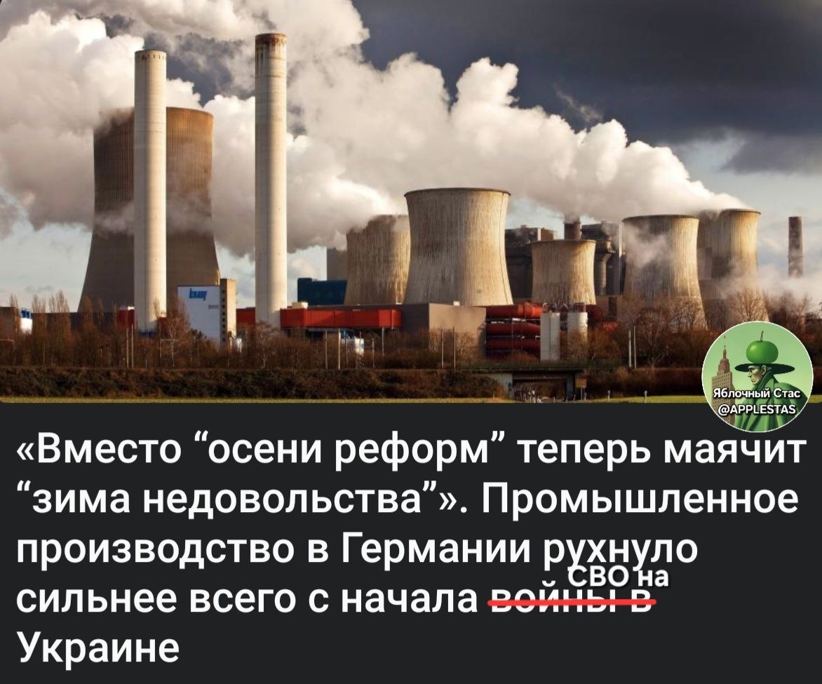 Гансы, надо терпеть. Еще не все ваши еврики Урсула и Наркочерчилль в офшоры вывели. Но есть и плюс. Скоро Германия добьется нулевых выбросов в атмосферу. Нет производства – нет загрязнений. Экологично, как вы и хотели. Яблочный Стас