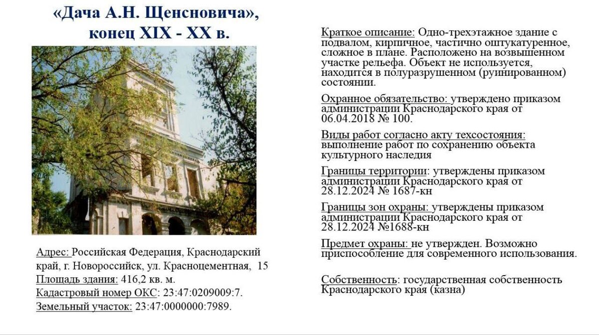 являющейся ОКН регионального значения «Дача А.Н. Щенсновича», конец XIX в. – начало XX в., находящееся в неудовлетворительном состоянии. Площадь передаваемого в аренду имущества Краснодарского края – 416,2 кв. м.