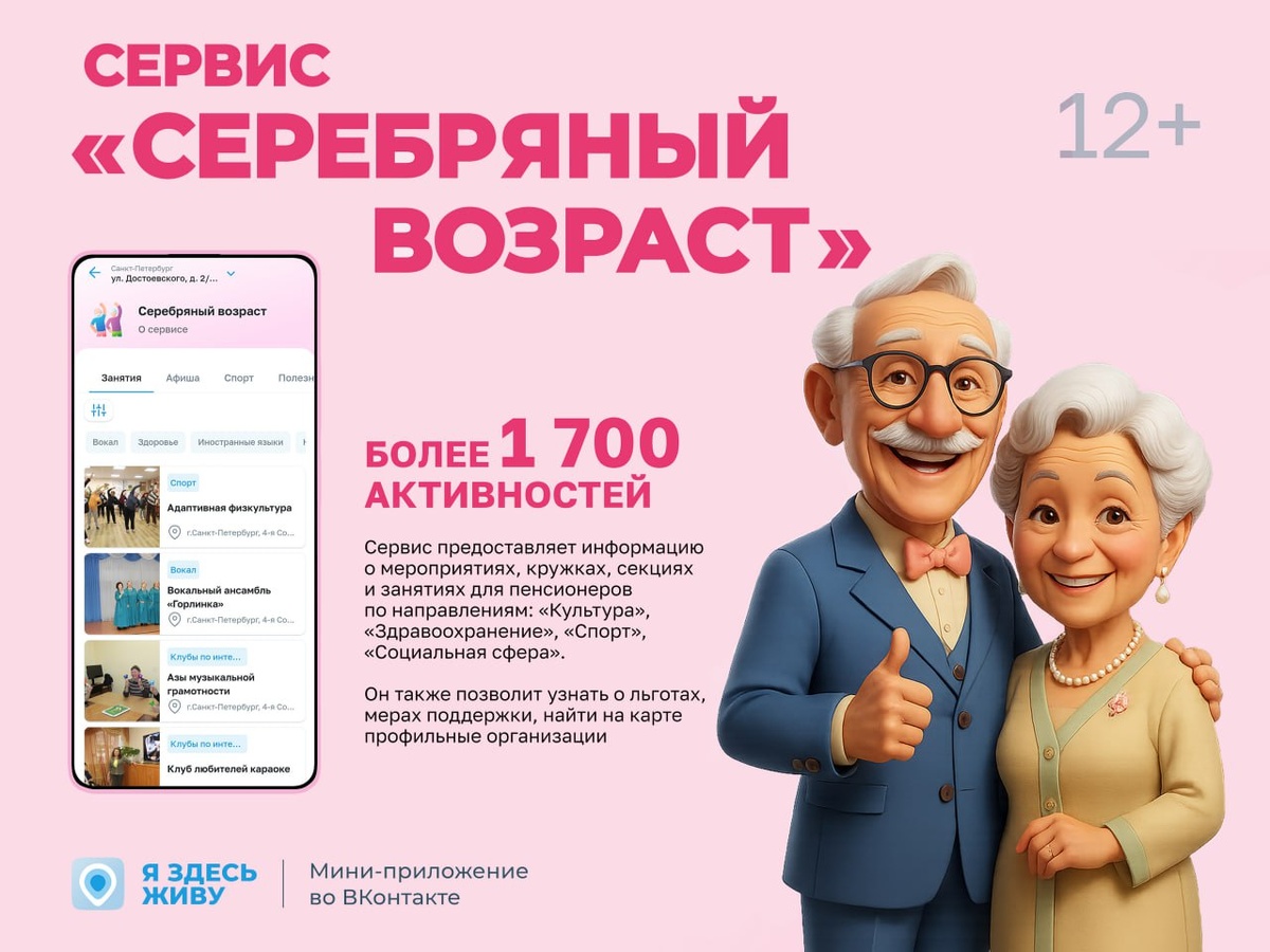Более 1700 городских активностей для граждан пенсионного возраста в сервисе «Серебряный возраст»! Теперь информацию о мероприятиях, кружках и секциях по направлениям спорта, здоровья, культуры и социального обеспечения для граждан старшего поколения можно найти в одном месте — Комитет по информатизации и связи объединил все события в единый сервис «Серебряный возраст» мини-приложения «Я здесь живу» во ВКонтакте. Как подобрать досуг: 1. Откройте мини-приложение «Я здесь живу». 2. Укажите адрес вашего дома в разделе «Профиль». 3. Перейдите в сервис «Серебряный возраст» и выбирайте, что по душе! Позаботьтесь о качестве своей жизни и не отказывайте себе в участии в культурной и спортивной жизни Петербурга! С сервисом «Серебряный возраст» сделать это будет легко и удобно по ссылке.