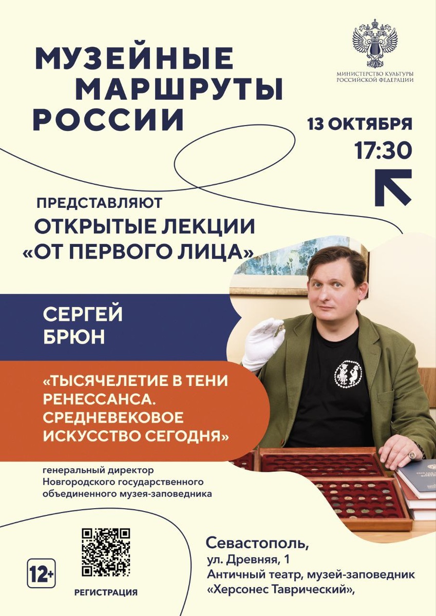 Музей-заповедник «Херсонес Таврический» приглашает севастопольцев на лекцию «Музейных маршрутов России» 13 октября директор Новгородского музея-заповедника, специалист по истории и культуре христианского Востока Сергей Брюн прочитает лекцию «Тысячелетие в тени Ренессанса. Средневековое искусство сегодня». Гостям расскажут об искусстве Византии, романской и готической Европы и Древней Руси, а также о новых исследованиях культуры «тёмных веков». Для участия нужно зарегистрироваться. Возрастное ограничение — 12+. 📺 СТВ 24 | Подписаться
