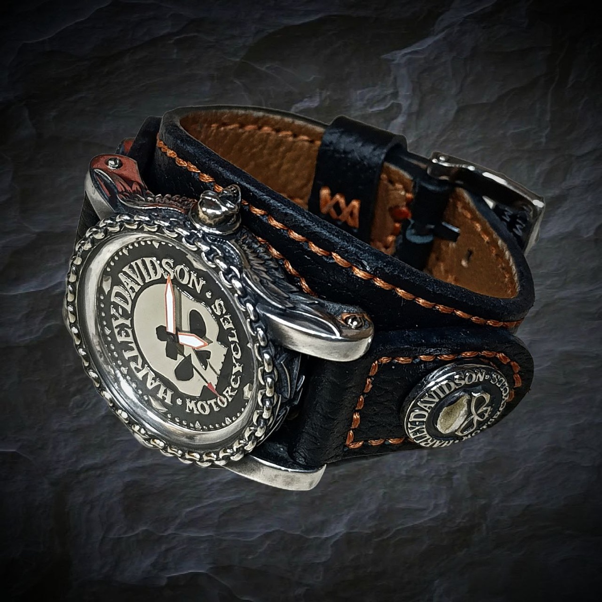 Часы "Harley-Davidson". Часы изготовлены из художественного сплава нейзильбер, покрыты серебром с нанесением патины. Ремешок ручной работы из кожи буйвола. Кварцевый механизм Ronda 715.