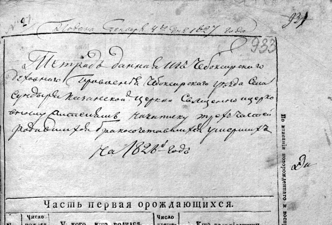 Метрические книги о рождении, браке и смерти за 1826 год. ГИА Чувашской Республики, фонд № 225, опись № 3, дело № 94, стр. 1578 скан. Тетрадь данная из Чебоксарского духовного правления Чебоксарского уезда села Сундыря Казанской церкви священно и церковнослужителям на записку трёх частей родившихся, бракосочетавшихся и умерших на 1826 год. Часть первая о родившихся. Стр. 1597 скан. Месяц ноябрь. № 77. 7 числа. Села Сундыря у экономического крестьянина Арефия Осипова дочь Стефанида обмолитвована и крещена того ж 7 числа. Восприемники: деревни Коноваловой экономический крестьянин Григорий Иванов, и выселка Чекур экономического крестьянина Мартьяна Никитина жена Марфа Осипова. Оную требу исправляли: священник Иоанн Коршунов, диакон Тимофей Киаксаров, дьячек Михаил Парисов, пономарь Феодор Именевский. https://yandex.ru/archive/catalog/cfd15a9e-2146-447b-af16-08b6ff52e83a/1597 Часть третья о умерших. Стр. 1631 скан. Месяц ноябрь. № 32. 21 числа. Села Сундыря экономического крестьянина А