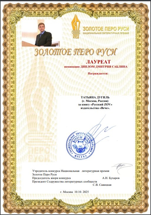 Не успела я в предыдущей публикации похвастаться, что книжка моя, самостоятельная и решительная девица, стала лауреатом конкурса "Золотое перо Руси", скромненько затесавшись единственной девочкой в десятку других лауреатов и дипломантов - сплошь военных журналистов и редакторов со всей России, как подоспело и подтверждение сего факта. Сопровожденное письмом с такими словами, каких мне отродясь не говорили... "Уважаемая Татьяна!!! Поздравляю Вас с получением Звания Лауреата Золотого пера 2025! К письму прилагаю Ваш Диплом. На сайте Национальной литературной премии Золотое перо Руси www.perorusi.ru помещены Итоги конкурса. Однако - в связи с невообразимо гигантским интересом к сайту, он может «виснуть» - Итоги дублированы на «В контакте» и на сети «Одноклассники» - https://ok.ru/profile138562904356/statuses/156809684396068 НАМ НЕ НРАВИТСЯ производить рассылку дипломов для лауреатов в электронном виде. Это нарушает десятилетиями установившуюся добрую традицию ЦЕРЕМНИЙ ВРУЧЕНИЯ ЗОЛОТОГО