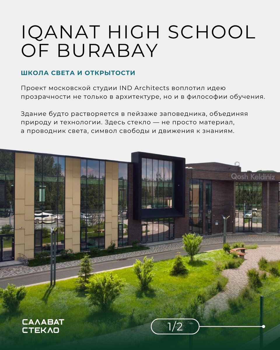 Когда архитектура становится прозрачной — рождается диалог между пространством, светом и человеком ✨ Школа-пансионат для талантливых молодых людей IQanat в Бурабае (Казахстан) по проекту московской архитектурной студии IND architects — пример того, как стекло формирует не только фасад, но и атмосферу доверия и открытости. В проекте использовано стекло MultiComfort° Neutral PRO от Салаватстекло — высокая прозрачность, нейтральный оттенок в отражённом свете и лёгкая зеркальность создают идеальный облик фасада и подчёркивают архитектурную эстетику. Инновационное покрытие обеспечивает энергосбережение, баланс света и солнцезащиту — всё, что делает здания комфортными и современными. Серия MultiComfort° Neutral PRO подходит для закаливания и термоупрочнения и представлена в двух версиях: 💎 MultiComfort° Neutral PRO 50 — для жаркого климата: защищает от перегрева и сохраняет прохладу. 💎 MultiComfort° Neutral PRO 60 — для умеренных широт, наполняющий пространство естественным светом. Сте