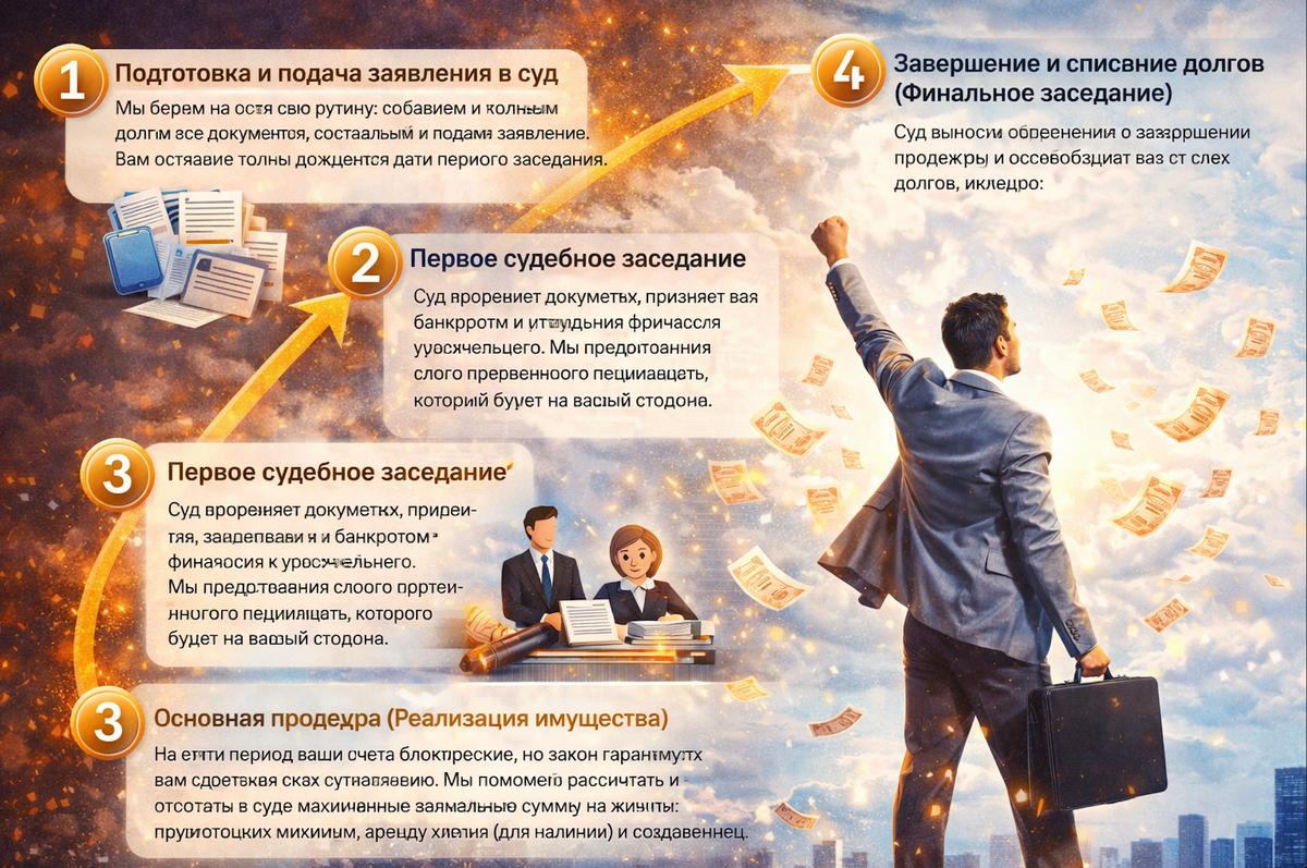 Здравствуйте всем, кто заглянул на мой канал! Вы уже подписались на канал? Ваша подписка - это сигнал, что мои заметки действительно помогают вам разбираться в сложных жизненных ситуациях, особенно когда речь заходит о долгах. Многие боятся запутанного процесса, но на деле он состоит из четырёх простых шагов, которые мы полностью ведём за вас: 1. Подготовка и подача заявления в суд Мы берём на себя всю рутину: собираем и готовим все документы, составляем и подаём заявление. Вам остаётся только дождаться даты первого заседания. 2. Первое судебное заседание Суд проверяет документы, признаёт вас банкротом и утверждает финансового управляющего. Мы предоставляем своего проверенного специалиста. 3. Основная процедура (Реализация имущества) На этот период ваши счета блокируются, но закон гарантирует вам средства к существованию. Мы поможем рассчитать и отстоять в суде максимально возможную сумму на жизнь: прожиточный минимум, аренду жилья (при наличии) и содержание иждивенцев. 4. Завершение и