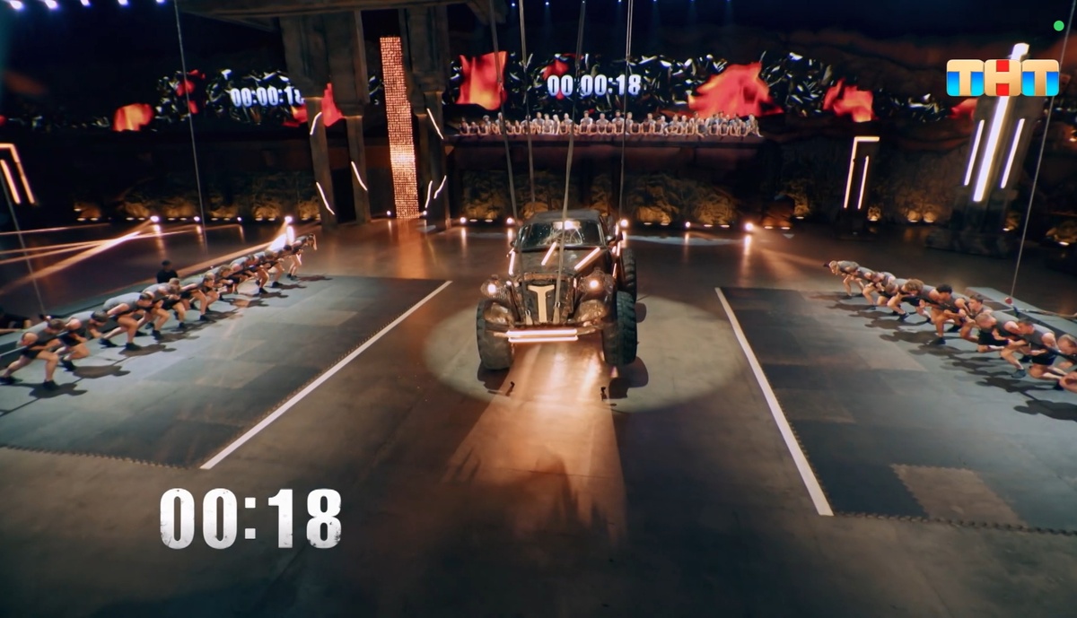Там была придумана система рычагов для поднятия. Каждой команде нужно было разделиться на две части и толкать вперёд по направлению к автомобилю две перекладины, к которым прикреплены тросы, поднимающие этот автомобиль, чем ближе подходишь к автомобилю, тем выше он поднимается. Нужно было дойти до линий, нанесённых на пол.