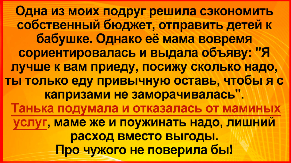 Знакомая история с тарелкой супа. Есть подружка одна из глубокой провинции. Не в обиду месту. Просто для понимания ситуации. В целом все у нее норм. нормальная работа, ребенок, муж, машина, но вот она все время пытается все дела скинуть на своих маму и папу мол потому, что они опять-таки в 90-ые скинули её на бабушку.