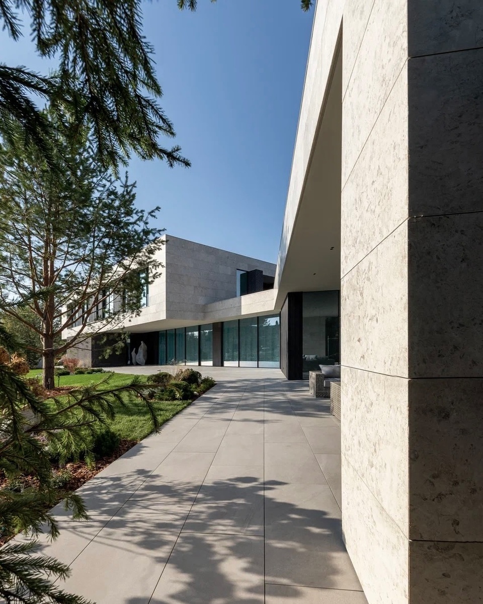 Внешняя приватность обеспечивается ландшафтной архитектурой: зеленые экраны, террасы, подступы к дому без прямых обзоров. Даже остекление продумано так, чтобы дневной свет попадал внутрь, но не создавал чувства “на виду”.