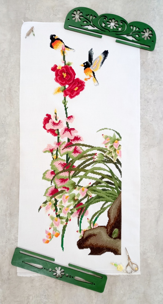 Вышивала по китайскому набору на белой канве, 11 каунт, размер 30х80 см, 20 500 крестиков. Осталось оформить, и как вы видите - буду делать панельку, держатели деревянные купила на Озон и покрасила зеленой акриловой краской - здесь тоже всё подошло, смотрится просто великолепно!