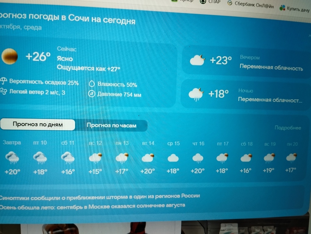 Сегодня последний жаркий день в Сочи. Ночью гроза и похолодание. Вот сколько показывает градусник на входе в корпус сегодня днем: Ходили с утра на море. Платные матрасы не брали. Но на лежаках жестко. Рабочие разбирают все больше и больше конструкций, скоро ничего не останется. Вот всегда мы ездим то еще не готово, то уже поздно. Надо уже как-то в сезон съездить. Погода приятная, но купаются не многие, вода прохладная. Потом мы вернулись в санаторий на обед. Обед так себе. Вкусным был только салат из помидоров и огурцов, картошка была с нежующимся мясом, суп официально с мясом, а на деле там один крохотный кусочек, в рыбе сплошные кости, а арбуз вялый и пресный. Еще принесли апельсины, вот они были вкусные. Мы походили по территории, посмотрели на рыбок в бассейне. На солнышке их хорошо видно. Но бассейн весь грязный и облезлый. Может моют его один раз в начале сезона. Но ведь путевки продают и в другие, не летние месяцы, но считают, что и так сойдет. Мы узнали у охранника, что можно