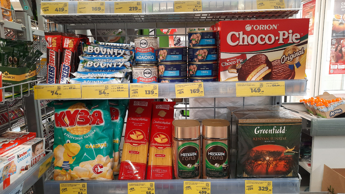 Приветствую вас, мои дорогие друзья и подписчики. Покажу вам витрину у кассы с товарами со скидкой по карте в Магните у дома. Магазин находится по адресу Ростовская область, Зерноградский район, станица Мечетинская, улица Ленина 50. Водка Тундра Authentic Водка Крайнего севера 40 % 0.5 л цена со скидкой по карте 419.99 рублей. Вино игристое Ла Петит Перле белое полусладкое 0.25 л цена 169.99 рублей. Масло подсолнечное Благо рафинированное дезодорированное 1 л цена со скидкой по карте 124.99 рублей. Водка Беленькая Люкс 40 % 0.25 л цена 219.99 рублей. Роллтон лапша Куриная по домашнему 90 г цена со скидкой по карте 54.99 рублей. Choco Pie печенье в шоколадной глазури 360 г цена со скидкой по карте 134.99 рублей при покупке от 2х штук. Северная Гавань Тунец филе в собственном соусе 185 г цена со скидкой по карте 169.99 рублей. Рогачевъ Молоко сгущенное цельное с сахаром ГОСТ 8,5 % 380 г цена со скидкой по карте 139.99 рублей. Баунти Батончик Молочный 55 г цена со скидкой по