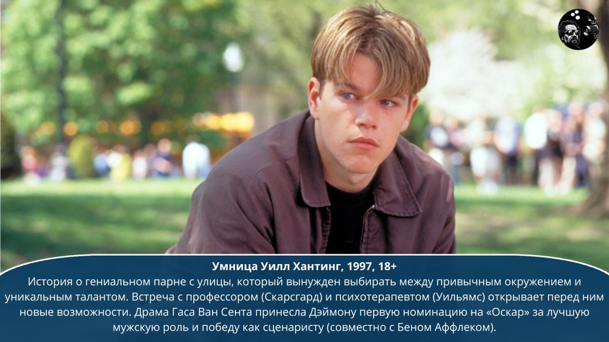 Туз в рукаве. Мэтту Дэймону — 55! Голливуд привык делать звёзд из красавцев. На фоне Брэда Питта, Джорджа Клуни, Леонардо Ди Каприо Дэймон всегда выглядел парнем «с соседней улицы». Но именно кажущаяся простота без налёта глянца и стала его визитной карточкой. Один из самых дорогих и востребованных актёров Голливуда мастерски воплощает героев и подлецов, трудяг и аферистов, простачков и серых кардиналов. Его персонажи бывают крайне убедительны как в благородных порывах, так и в корыстных целях. Наша традиционная подборка, увы, по-прежнему нерезиновая, потому за скобками остались знаковые роли второго плана, как рядовой Райан («Спасти рядового Райана») или лейтенант Лесли Гровс («Оппенгеймер»). А о некоторых хороших фильмах, которые не столь известны, ещё обязательно расскажем по случаю. Большой Киновски 🎬 | #картотека #киноперсона #киноподборка