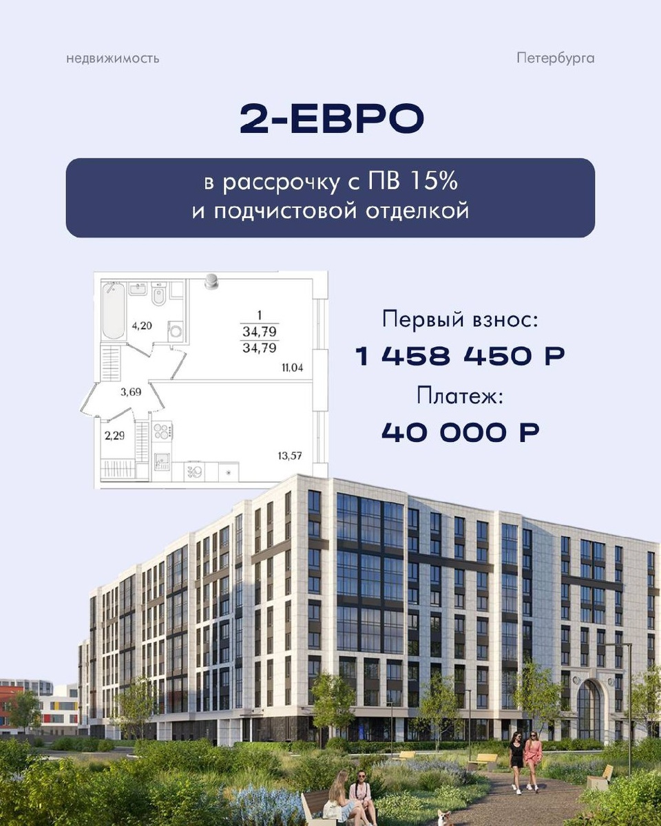 Квартира с первоначальным взносом всего 15% Вернулась одна из самых удобных форм оплаты — рассрочка с первоначальным взносом всего 15%, почти на 3 года. Сделали расчет на примере 2-евро планировки в проекте с парками и современной инфраструктурой. ↖️ Условия Стоимость квартиры: 9 723 000 ₽ Первый взнос: 1 458 450 ₽ Платёж: 40 000 ₽ в месяц до 31 мая 2028 года Остаток можно закрыть своими средствами или перейти на ипотеку. Квартира с подчистовой отделкой, можно дозаказать чистовую, включив её в ипотеку. 📌 О жилом комплексе — Локация в развитом районе с парками, скверами, школами и садами в шаговой доступности — Современные 9-этажные корпуса, уютные дворы только для жителей — 2 детских сада, большая школа, магазины и кафе прямо в комплексе — Отапливаемый подземный паркинг, дизайнерские входные группы, видеонаблюдение — Редкие форматы квартир, можно подобрать под любой сценарий жизни Если хотите узнать подробнее о рассрочке или планировках — пишите в личные сообщения.