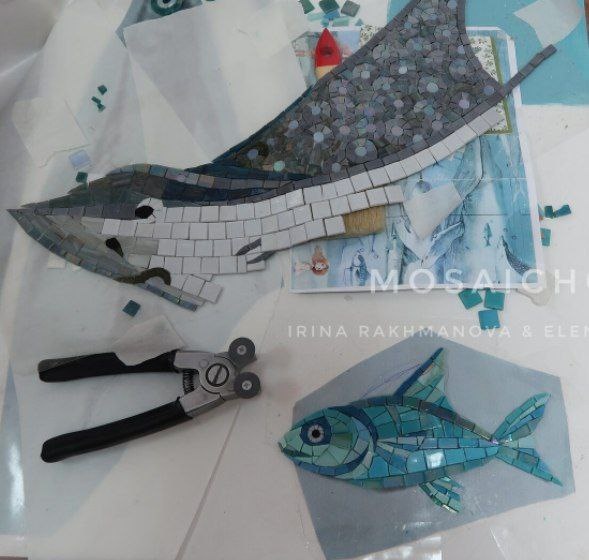 Начало работы над панно "Подводный мир" В этой работе мы использовали мозаику из коллекции 20х20 и 15х15, матовые и перламутровые оттенки. Это красивое панно украсило детский сан.узел