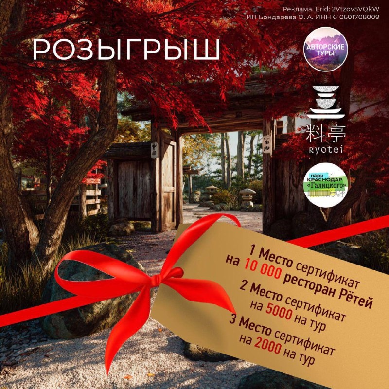 Осень — время ярких эмоций и природы. Парк «Галицкого» и «Авторские Туры» проводят розыгрыш призов. Призы включают: - I место: сертификат 10 000 ₽ в ресторан «Ryote». Насладитесь японскими блюдами и прогулкой в саду. - II место: подарочный сертификат 5000₽ от «Авторских Туров» для идеального путешествия. - III место: сертификат 2000₽ от «Авторских Туров» для новых открытий. Итоги подведут 17 октября в 21:00. Всем удачи и прекрасной осени!