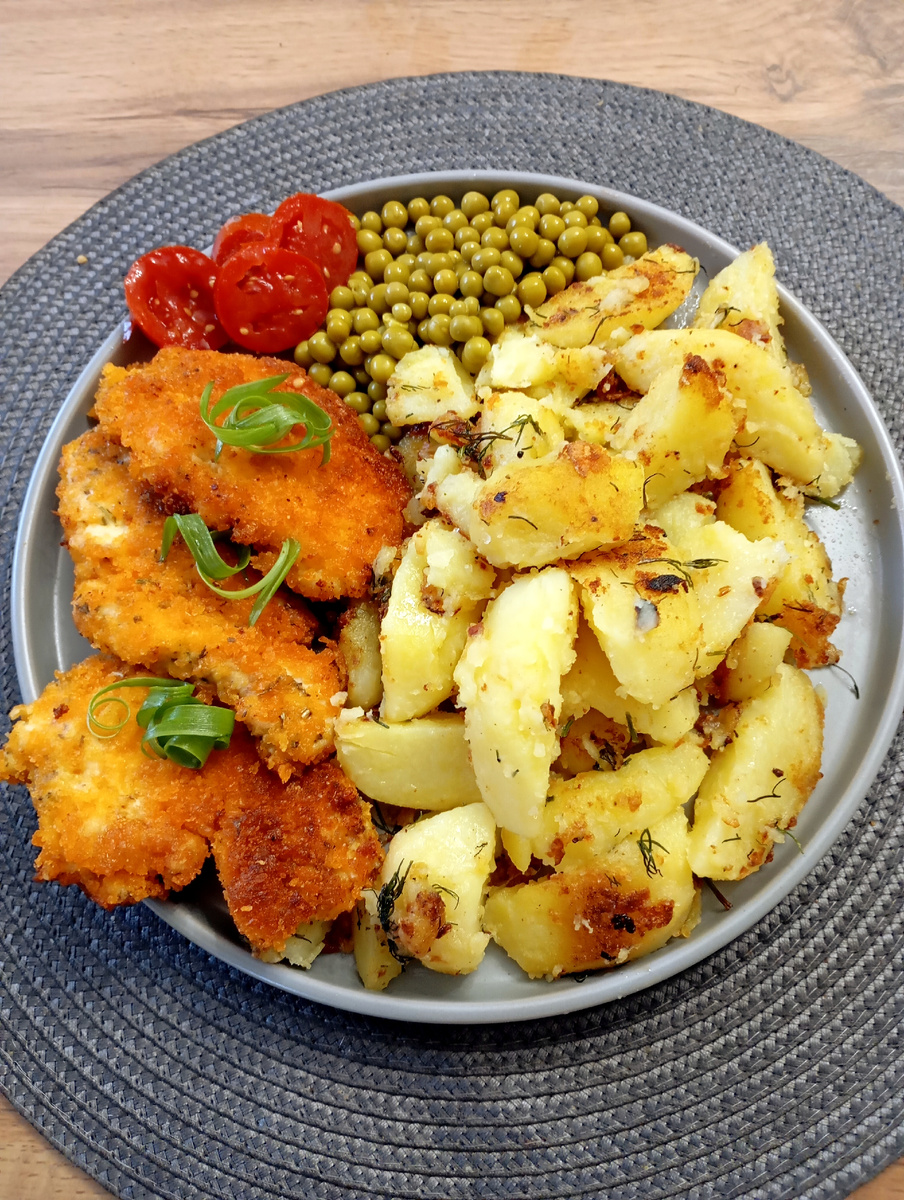 Доброе утро, день или вечер, дорогие читатели! Уже среда и я с утра у плиты. А ещё у нас сегодня пошёл дождь, впервые наверно за месяц, плюс холодный ветер . Одним словом - непогода! Я спешу, готовлю своим ребятам на работу обед. Сначала я отварила картофель дольками, а из куриного филе сделала отбивные. Приготовила сразу панировку: мука, льезон, панировочные сухари. Филе куриное большими кусочками отбила молоточком специальным, добавила специи прованские и для курицы, сухой чеснок, оставила пропитаться, посолила, поперчила Сначала обваляла в муке, потом в льезоне, затем в панировочных сухарях Панко. Жарила на сковороде на растительном масле с двух сторон. Отдельно поджарила отварные дольки картофеля и добавила свежий чеснок. Филе в панировке положила на салфетку, чтобы впиталось лишнее масло. Приступила к формированию блюда. Выложила на тарелку кусочки филе в панировке, затем картофель, зелёный горошек. Сбоку маринованная помидорка, и спиральки из зелёного лука. Конечно можно по