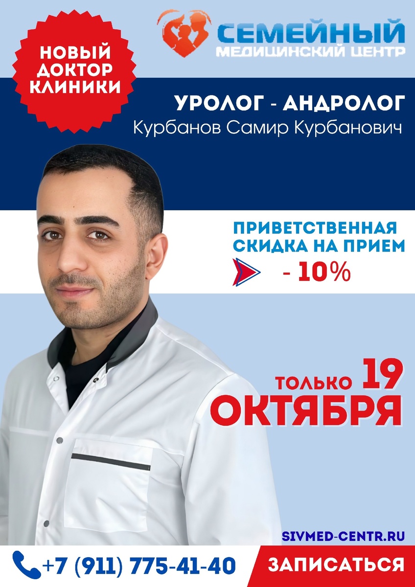 Акция "Знакомство с доктором": Первая консультация со скидкой 10% Уролог-андролог ✅ Курбанов Самир Курбанович Приём взрослых пациентов старше 18 лет. Начало приема - 19 октября! 👉🏻 clck.ru/3PiaHL ⭐ Сайт ПроДокторов - Здесь вы найдете честные отзывы пациентов Самира Курбановича Начните заботиться о своем здоровье прямо сейчас и доверяйте его только профессионалам 🙌 📞 Запись доступна онлайн на сайте sivmed-centr.ru или по телефону +7(911)775-41-40 Адрес клиники: пос. Сиверский, ул. Вокзальная, д. 4 Наш канал в Max, вступайте Источник: Открыть