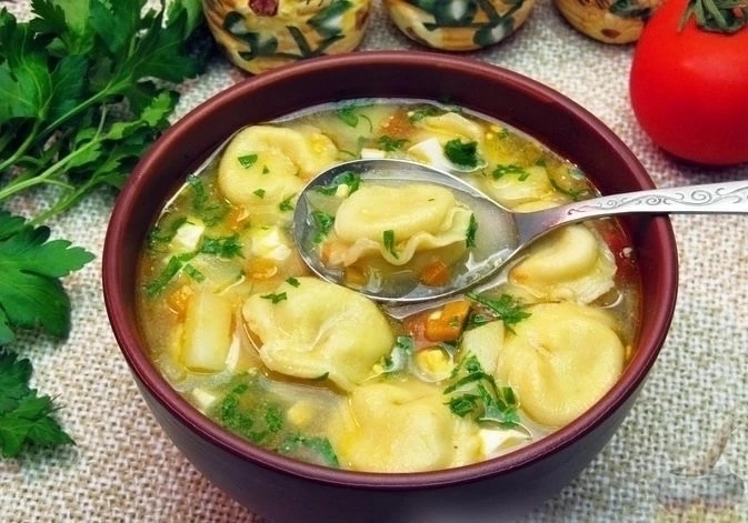 🍲 Ингредиенты: ◾️ Пельмени замороженные - 250 г ◾️Яйца - 2 шт. ◾️Картофель - 350 г (2 шт.) ◾️Помидоры - 150 г ◾️Морковь - 100 г ◾️Лук репчатый - 80 г ◾️Чеснок - 1-2 зубчика ◾️Петрушка свежая - 10 г ◾️Лавровый лист - 1-2 шт. ◾️Перец душистый горошком - 5 шт. ◾️Перец молотый (смесь перцев) - по вкусу ◾️Соль - по вкусу ◾️Масло подсолнечное - 2 ст. ложки (30 мл) ◾️Вода - 1,2 л Способ приготовления: 1️⃣ Яйца отвариваем вкрутую (10 минут после закипания), после чего остужаем в холодной воде. Яйца очищаем и нарезаем кубиками или разминаем вилкой. 2️⃣ В кастрюлю наливаем 1,2 л воды. Одну картофелину очищаем и кладем в кастрюлю. Доводим до закипания и отвариваем картофель 20 минут. 3️⃣ За это время очищаем лук и морковь. Морковь и лук нарезаем кубиками. На сковороде с разогретым маслом обжариваем лук и морковь около 5 минут до золотистого оттенка. 4️⃣ Чеснок очищаем и измельчаем ножом. Помидоры опускаем на 1 минуту в кипяток, после чего снимаем кожицу. Помидор без кожицы нарезаем куби