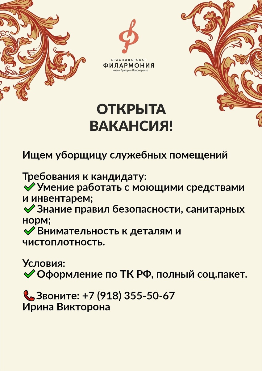 ❗️ОТКРЫТА ВАКАНСИЯ❗️ Филармония приглашает на работу уборщицу служебных помещений: Требования к кандидату: ✔️Умение работать с моющими средствами и инвентарем; ✔️Знание правил безопасности и санитарных норм; ✔️Внимательность к деталям и чистоплотность. Условия: ✔️Оформление по ТК РФ, полный соц.пакет; ✔️Размер заработной платы устанавливается по результатам собеседования. 📞Телефон: +7 (918) 355-50-67 Ирина Викторовна