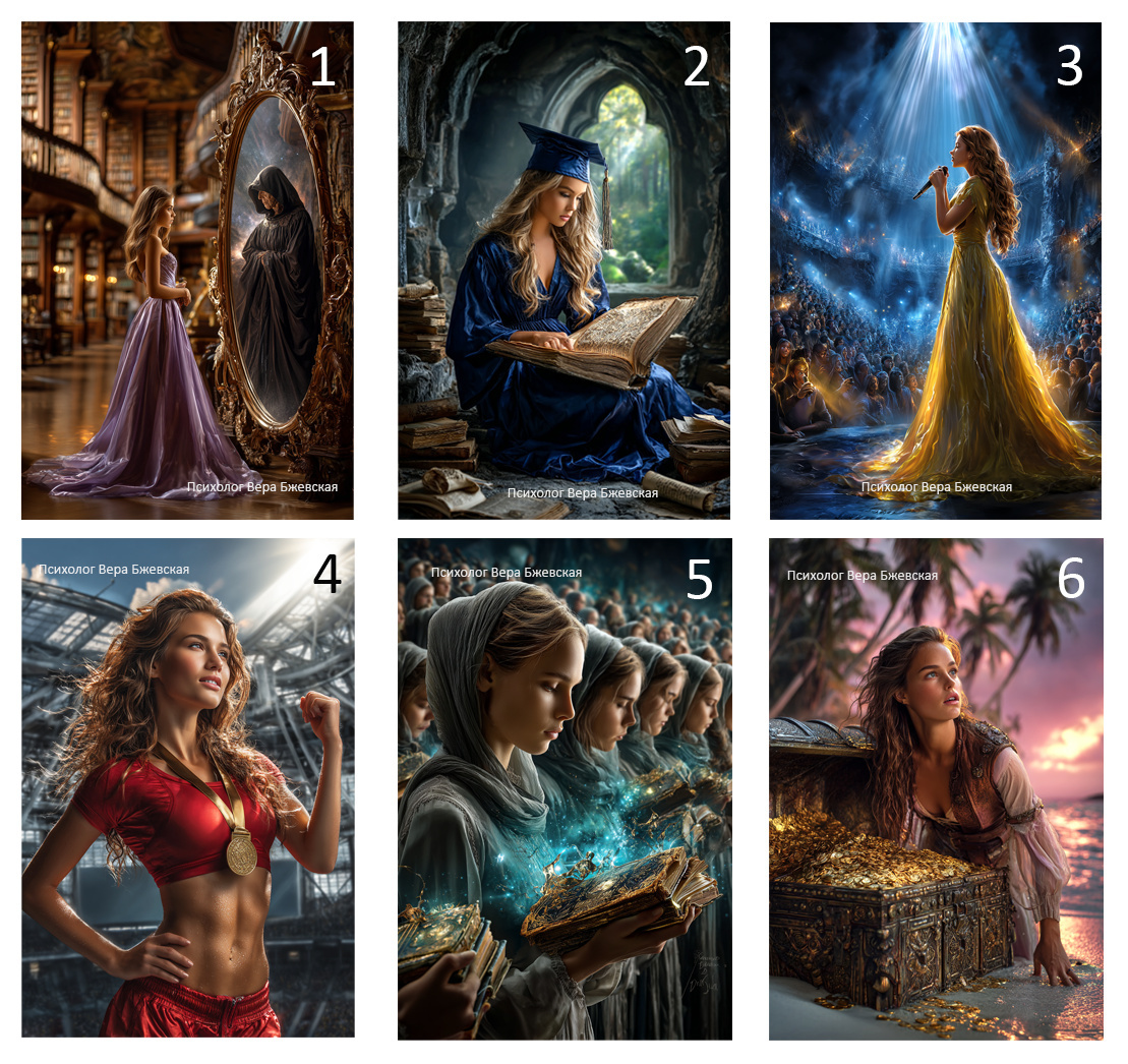 Итак, посмотрите на все 6 изображений и выберите то, которое сильнее всего откликается эмоционально. Не анализируйте, доверьтесь своим ощущениям. Именно эта карта подскажет, где спрятан ваш главный страх, и подсветит направление, в котором стоит сделать следующий шаг в будущем.