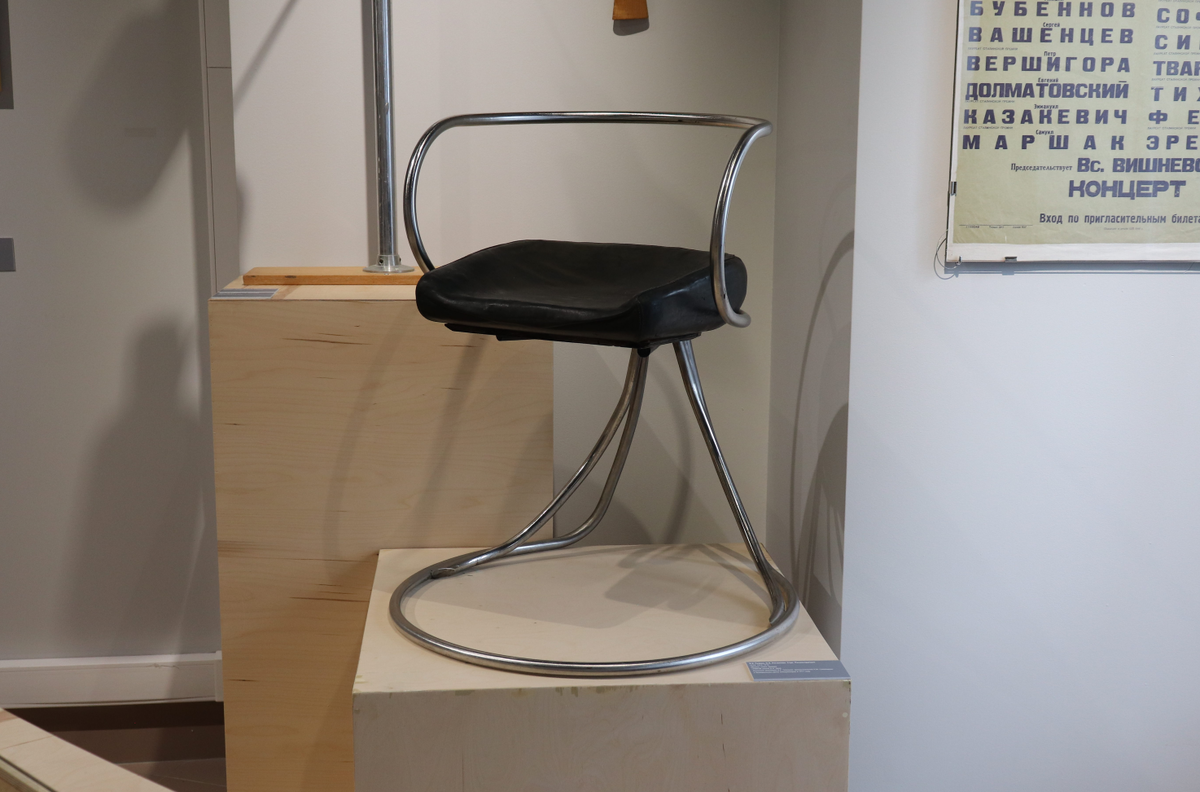 На выставке, проходившей в честь юбилея Симонова, показали старый стул весьма необычной формы, стоявший некоторое время в кабинете поэта. Фишка стула – самобалансирующаяся конструкция из гнутых металлических трубок, в магазине вы такую навряд ли найдете. А откуда такой стул взялся у Симонова? Потому что он в какой-то мере вернул Родине память о таком талантливом человеке как Владимир Татлин. Помните такого художника и дизайнера? Это он придумал в холодном 1920 году «Башню Татлина», памятник III Интернационалу с закрученной железной спиралью, в реальности так и продвинувшийся не только на планировавшуюся высоту в 400 метров, а вообще не сдвинувшийся с места дальше макета. Интересно, что с одной стороны высмеивавший все связанное с революцией Аверченко не смог пройти мимо «Башни Татлина» и прошелся по проекту в одном из своих рассказов. А с другой большевики тоже в начале 30-х годов напрочь отказались от авангарда и конструктивизма в пользу имперского классицизма, объявив все, что не в