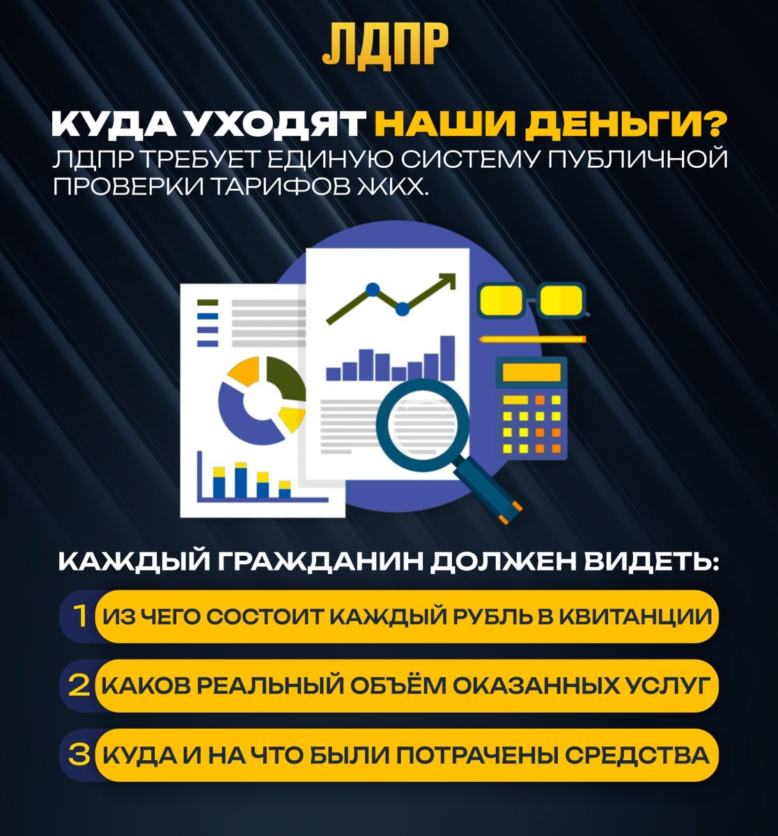 Куда уходят наши деньги? ЛДПР требует единую систему публичной проверки тарифов ЖКХ 📊Каждый месяц москвичи получают квитанции с новыми цифрами. Но никто не объясняет, почему плата выросла, на что именно идут деньги и насколько это обоснованно. По данным проекта «Активный гражданин», более 65% москвичей не понимают, из чего складывается их платеж за ЖКХ. Существующая система тарифообразования непрозрачна и выгодна в первую очередь ресурсоснабжающим организациям. Решение от ЛДПР: ➡️Создать единую государственную систему публичной проверки тарифов. Каждый гражданин должен иметь доступ к онлайн-платформе, где в простом виде видно: ✅из чего состоит каждый рубль в квитанции; ✅каков реальный объём оказанных услуг; ✅куда и на что были потрачены средства. Это остановит произвол и заставит компании обосновывать каждую копейку в платежках. Требуем прозрачности!