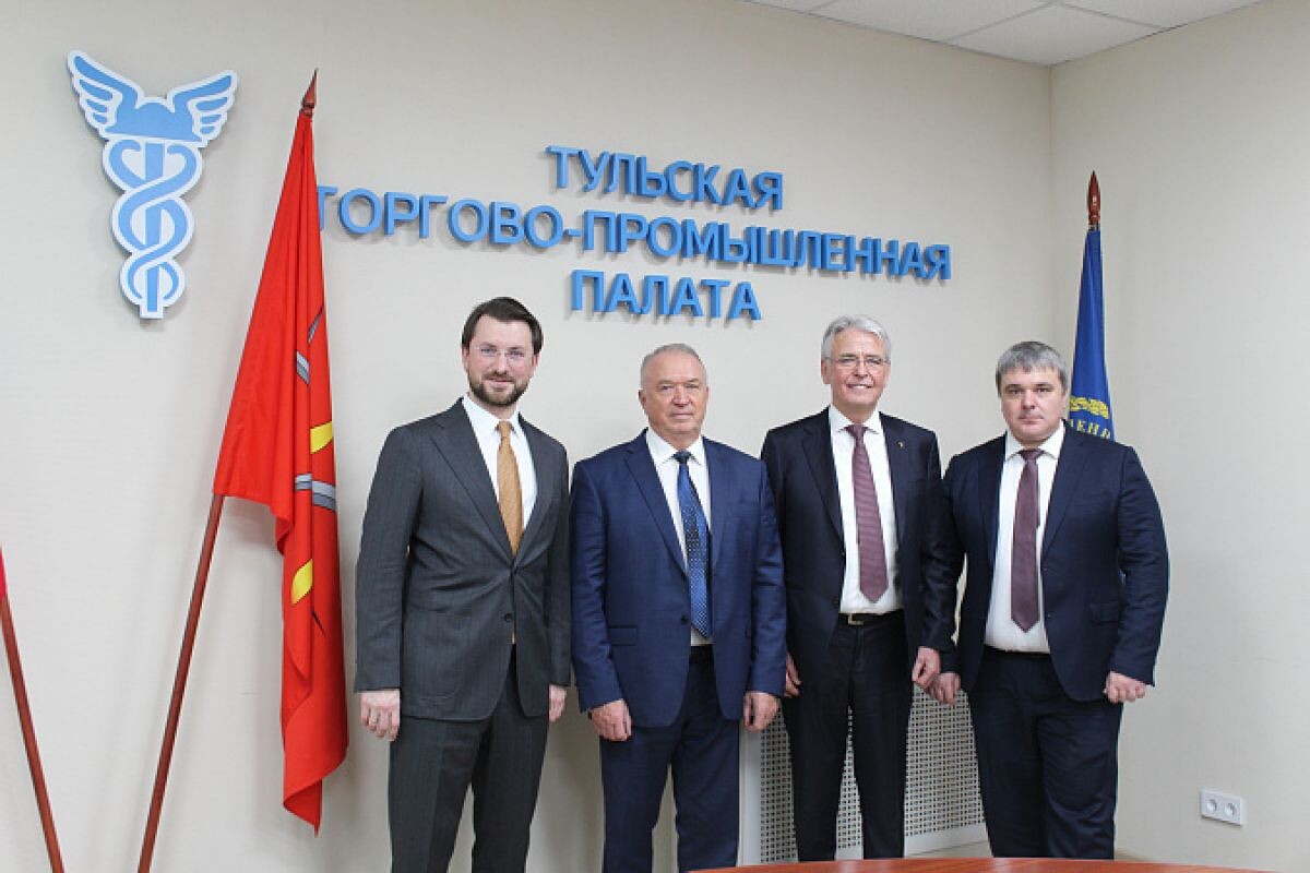Перед заседанием президент Торгово-промышленной палаты РФ Сергей Катырин посетил Тульскую торгово-промышленную палату (ТТПП), где встретился с заместителем председателя Правительства региона Павлом Татаренко.