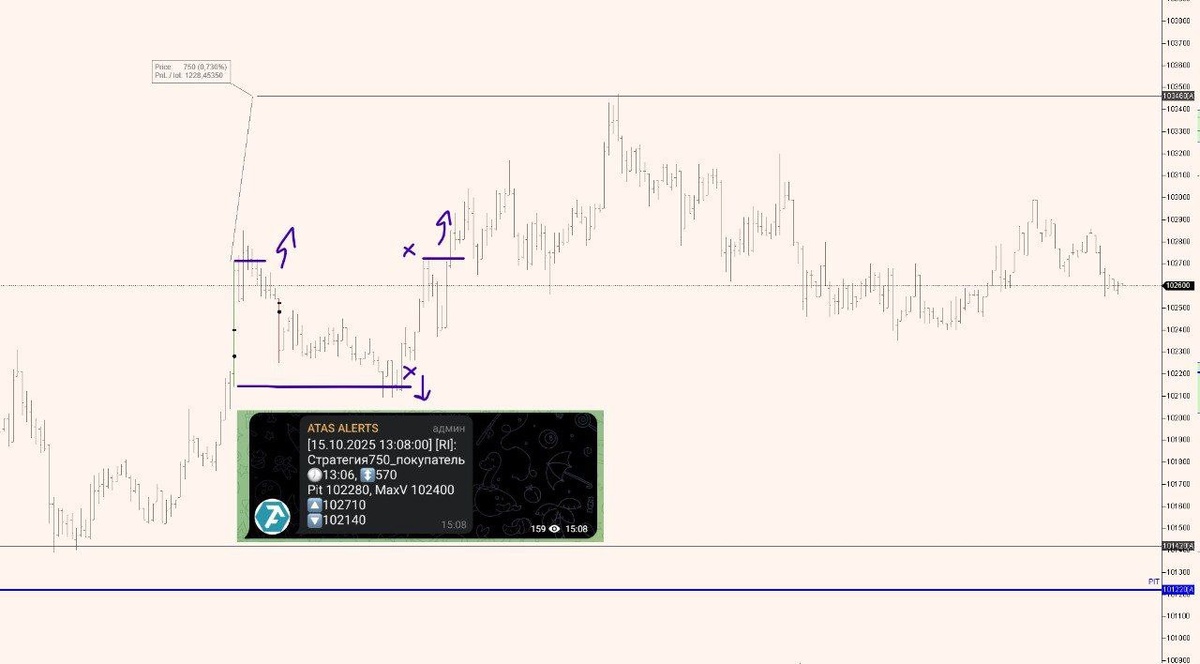 📈 Стратегия 750 Вход на акцепте — направление лонг. Недошли. Переворот в шорт. Ещё один переворот — и цель достигнута. Итак, было два переворота, каждый на размер сигнального бара. Общий убыток составил –1140 пунктов. Далее — доход до цели: +750 пунктов. 📊 Итог по стратегии сегодня: –390 пунктов. Обратите внимание на точный доход до цели (пусть и со второго раза 😀) — ровно +750 пунктов и разворот. Это трейдинг, основанный на статистике и действиях крупных игроков. Второе усилие по стратегии торгуется отдельно: по нему тоже был переворот и доход до цели. Так как бар был меньше, убыток составил –290 пунктов, прибыль +750. 📈 Итого по второму усилию: +460 пунктов. В целом за день — прибыль 100 пунктов. Не ИИР