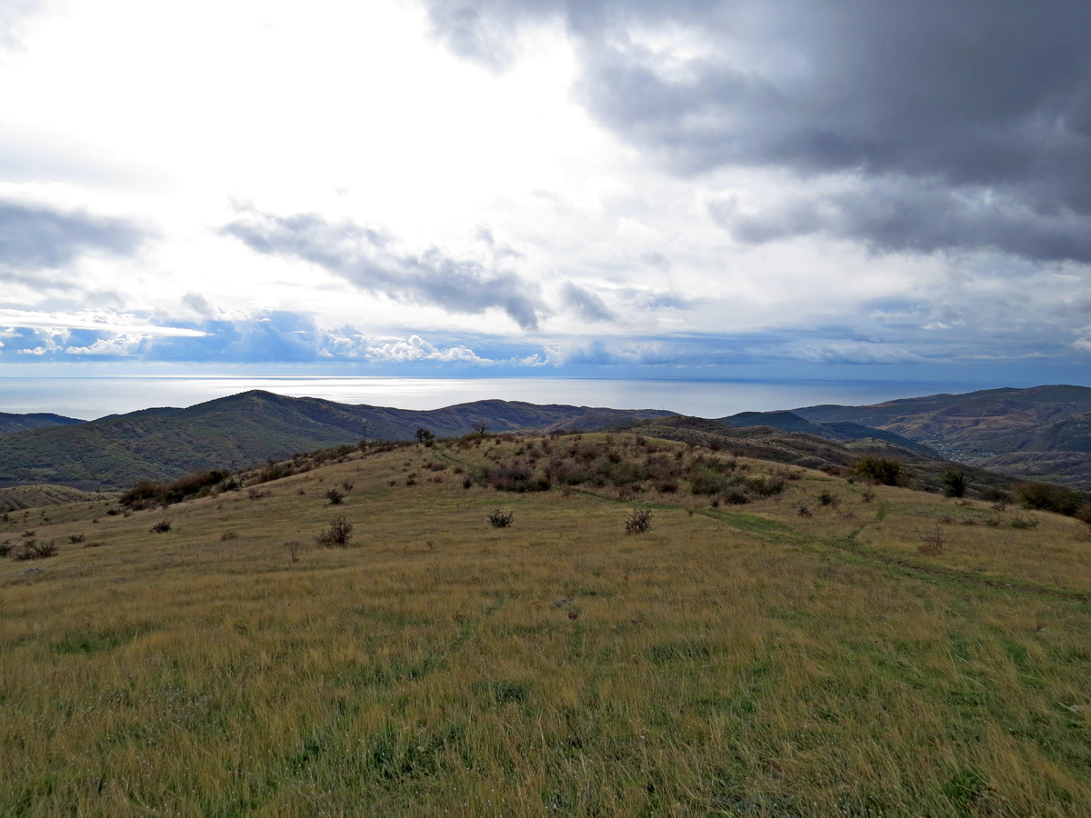 Так потихоньку, между грибов и ягод, мы поднялись на шикарную смотровую площадку, на хребте Хырылмыш- Даг. Это место мы уже знаем. Поднимались из Зеленогорья. Наша дорога туда и направляется. В одном из своих рассказов, я показывала те мощные подпорные стенки и саму дорогу, плавно идущую по склонам балки. Поднялись на пригорок, чтобы посмотреть вокруг. Миша и Татьяна, снова увлеклись поисками грибов. Ну, а с Виктором, как обычно — фотками. Теперь противоположный борт ущелья почти весь вместился с горами. Долго я выучивала эти вершины! Зато теперь могу махать руками и говорить названия. Все они выше 1000 метров. За ними находиться яйла Караби. И именно оттуда сейчас кусками, через перевал, ветер кидается в нас облаками и моросью. В другую сторону, горы Зеленогорья. Гордый Построфиль, стоит и дразнится своими завитками. Ну, не поднялась я на тебя. Зато была на Сори, которая выше! Давно мы тут не были. Скучаешь даже за знакомыми видами. Когда-то эти пики были для меня не досягаемы
