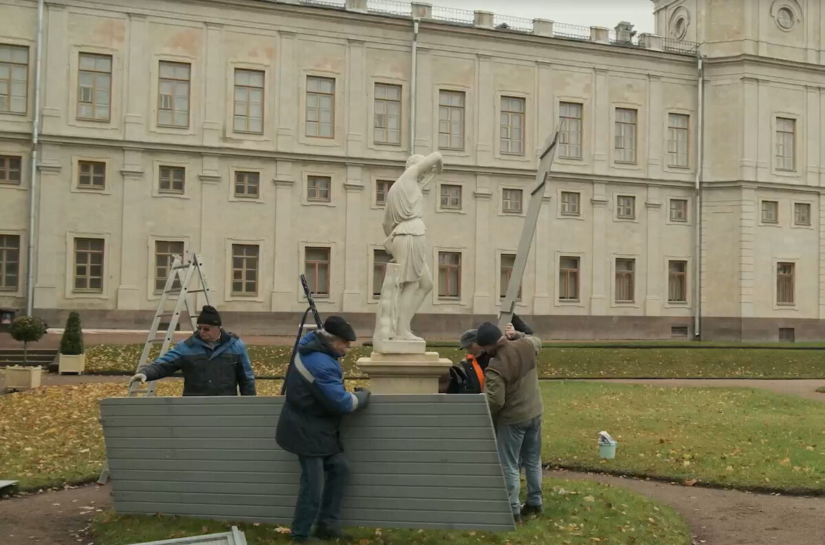 В Дворцовом парке музея-заповедника «Гатчина» в среду, 15 октября, подготовили к зиме парковые статуи.