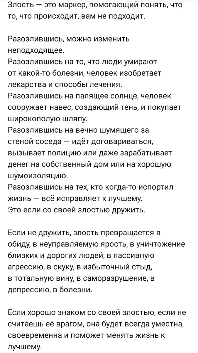 Год назад в начале октября я писала о том, что собираю группу о знакомстве со стыдом, а она всё никак не собирается. Точнее, есть несколько человек, которые ждут с самого лета, а с остальными сложно: только добавляется один, как уходит другой, приходят двое, уходят — трое. И очень хочется остановить уже этот вязкий процесс, который кажется бесконечным. Но знание о том, что есть люди, которые хотят и готовы ждать, подталкивает к тому, чтобы дать идее ещё шанс. В этом году группа о стыде собралась быстро. Даже есть уже желающие на следующий сезон через год. А вот группа, посвящённая знакомству со злостью, зависла. Есть несколько человек. Они ждут. Это моя попытка дать идее последний шанс. Описание здесь: https://www.b17.ru/training.php?id=107252 Встречи раз в две недели по четвергам. С 19 до 22 часов по московскому времени. Стоимость — 2000 рублей за встречу. В группе вы получите шанс лучше познакомиться с вашей злостью, заметить, когда используете её продуктивно, а в каких случаях ваш